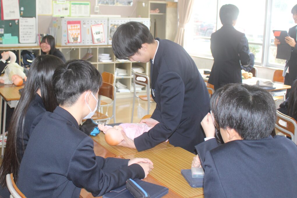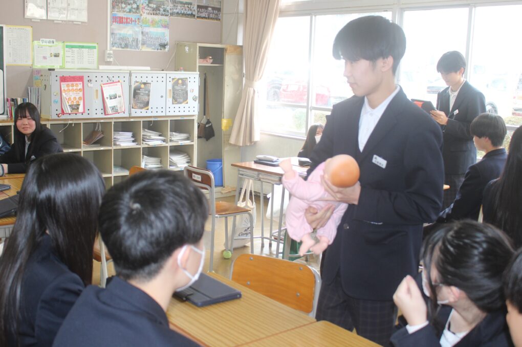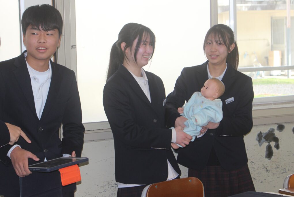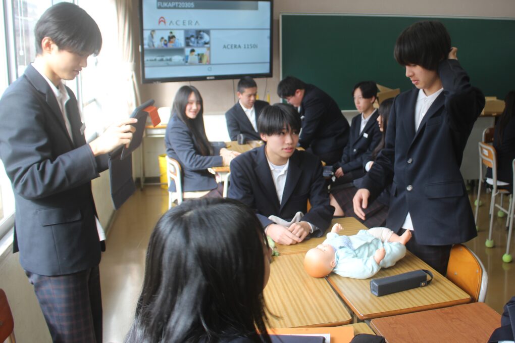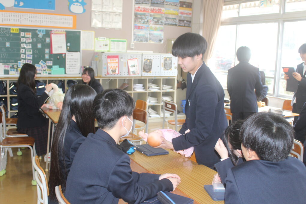 本日3年生が家庭科の授業で赤ちゃんの正しい接し方、だっこの仕方やおむつの交換の仕方についてグループで練習をしていました。寝ている赤ちゃんを正しくだっこできるか等タブレットで撮影しながら、取り組んでいました。重さ3kgのリアルな赤ちゃん人形を使って、真剣な表情で取り組みました。生徒の中から「命があると思って!」と声がかかったりもしていました。