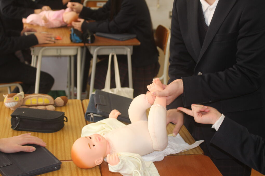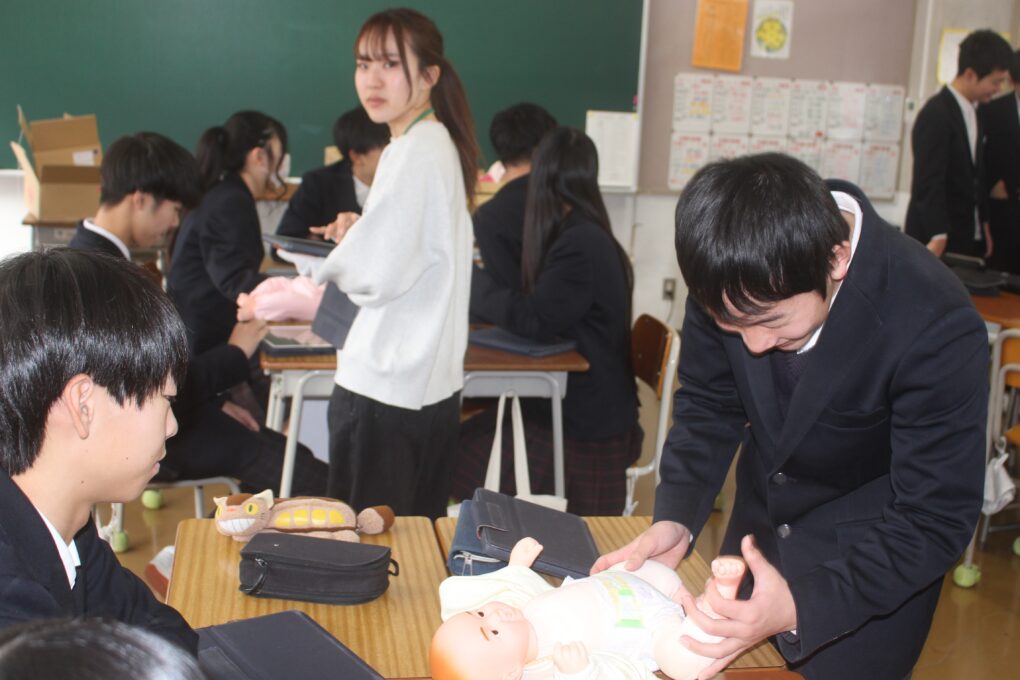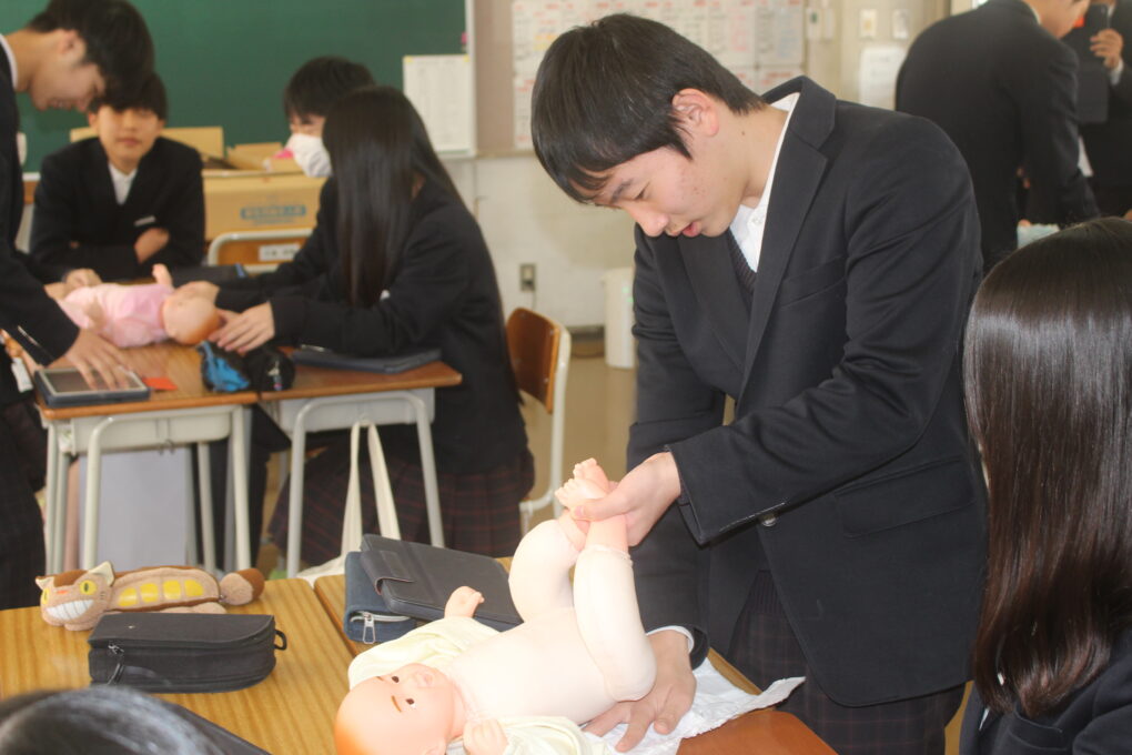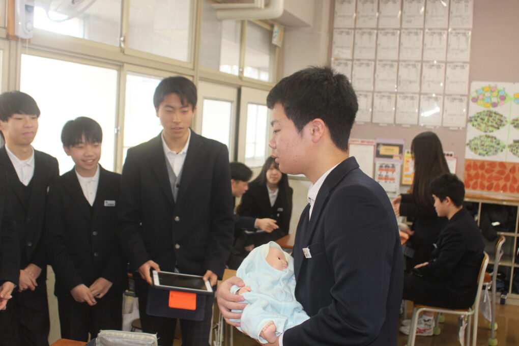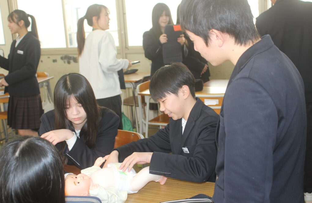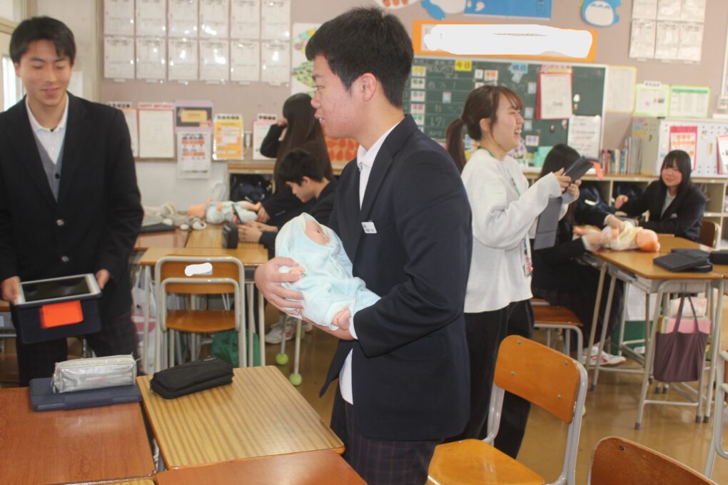 本日の成和中本日3年生が家庭科の授業で赤ちゃんの正しい接し方、だっこの仕方やおむつの交換の仕方についてグループで練習をしていました。寝ている赤ちゃんを正しくだっこできるか等タブレットで撮影しながら、取り組んでいました。重さ3kgのリアルな赤ちゃん人形を使って、真剣な表情で取り組みました。生徒の中から「命があると思って!」と声がかかったりもしていました。