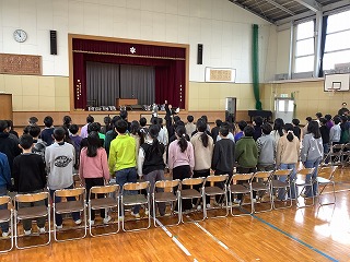 4・5年 卒業式練習 本日の遷喬小 Twitter Facebook はてブ Pocket LINE コピー 2026.03.11 2026.03.10 卒業式練習が始まりました。今回は、在校生練習で、動きの確認と歌の練習をしました。 残り2回の練習で本番を迎えます。気を引き締めて練習に臨み、本番で6年生をしっかり見送りたいと思います。