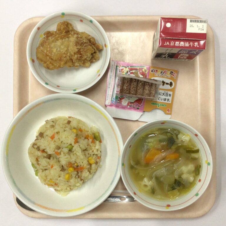 今日の給食:12月22日(月) 今日の給食 Twitter Facebook はてブ Pocket LINE コピー 2025.12.22 🥢カラフルピラフ 🥢鶏のから揚げ 🥢きらきら星のスープ 🥢お米deケーキ 本日で2学期の給食は終了となりました。 Post Views: 19