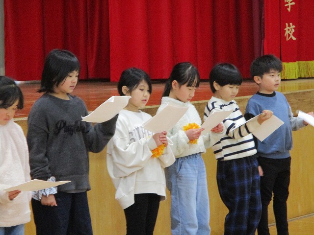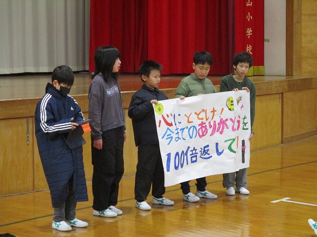 1月26日(月)の青空集会では2つの活動を行いました。1つ目は、5年生が中心となり「6年生を送る会」のテーマを全校に紹介しました。テーマは「心にとどけ!今日までのありがとうを100倍返しで!」です。
