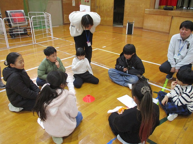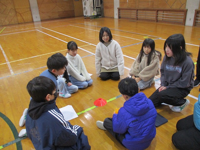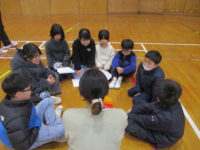 2つ目は、2・3年生児童の提案した「お題」に基づき、グループごとに話し合いをする活動です。「苦手な食べ物は何ですか」と聞かれ、しばらく考える子、恥ずかしそうに答える子、「私も同じ!」と共感する子などいろいろありましたが、急かしたり、否定的な発言をしたりする子は誰1人いませんでした。温かい声かけが自然に生まれ、安心して自分の思いを伝え合うことができました。今回の集会を通して、自己表現すること、そして相手の想いを受け止めることの大切さを全校で改めて学ぶ機会となりました。