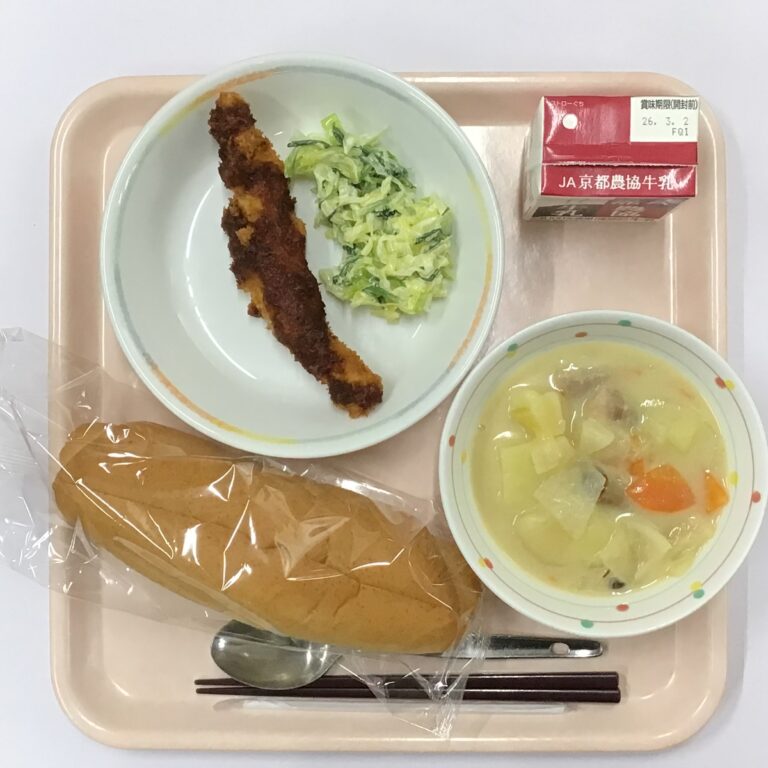 今日の給食:2月18日(水) 今日の給食 Twitter Facebook はてブ Pocket LINE コピー 2026.02.18 🥢全粒粉パン 🥢チキンカツ 🥢添え野菜 🥢米粉のホワイトシチュー Post Views: 25