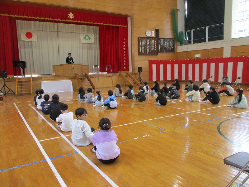 校長からは、児童に3つのことを中心にお話ししました。1つ目は、「自分のことは自分でやろう」すでに自分の力でできるようになっているかもしれませんが、改めて自分の生活を見直してほしいと思います。朝起きることから、身支度、あいさつ、準備など、誰に言われるでもなく、自分から行動を起こしてほしいです。2つ目は、「友達のことを大切にしよう」自分のことも好きになり、自分のいいところを見つけられると、友達のよいところもたくさん見つけられます。そうすることで、友達を大切にしてほしいと思っています。3つ目は「命を大切にしてほしい」かけがえのないたった一つの命です。交通安全もそうですが、自分の所在を明らかにすることも大切です。家を出るときには、必ずお家の人にどこに行き、何時ごろに帰るのか伝えようと話しました。