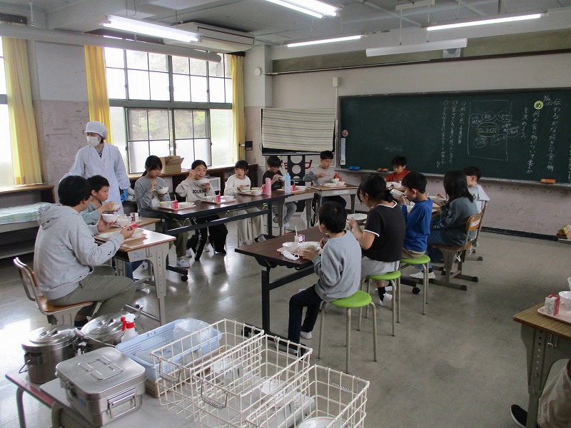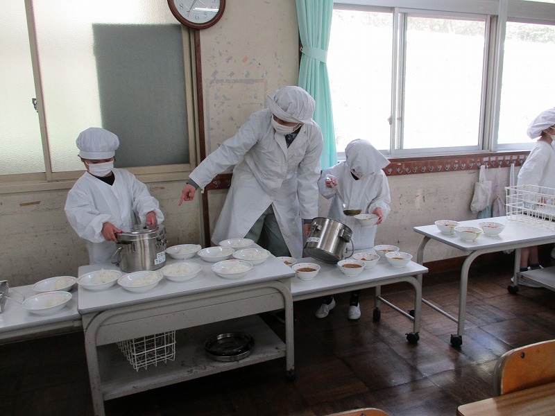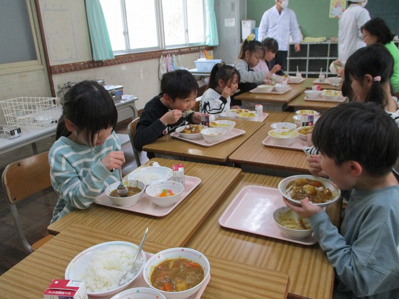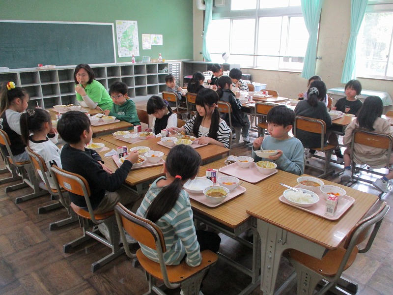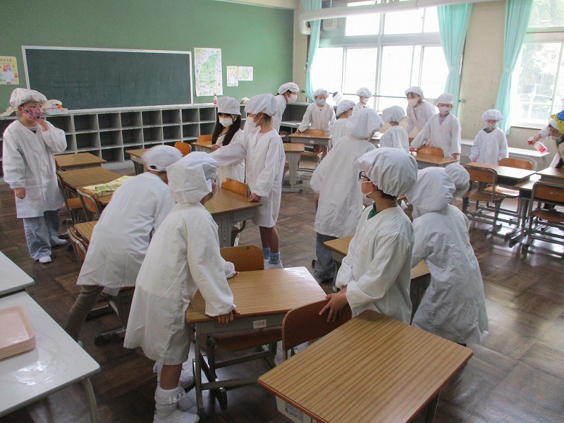 下山小学校では、今年度より1年生から4年生と5年生、6年生の2つのグループに分かれて給食を食べます。学年の人数が少なくなったことと、それぞれの発達段階に応じた集団づくり(4年生をリーダーとする低学年グループと学校のリーダーとなる5,6年生の高学年グループ)を目的とする活動の一環です。