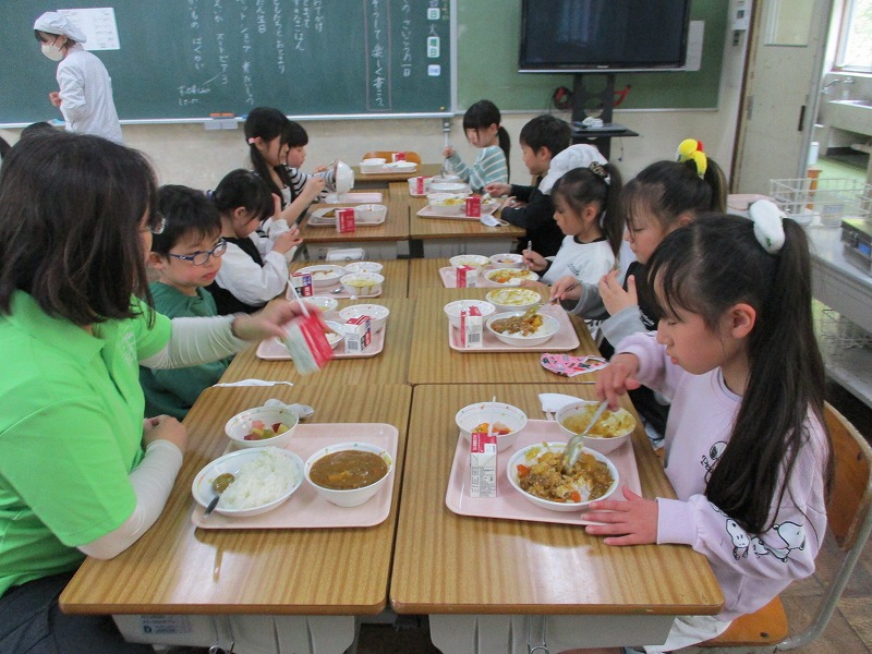4月14日(火)から、今年度の給食が始まりました。1年生にとっては、小学校での初めての給食でした。