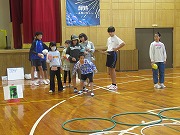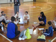 まずは、中学生のよさこいを披露してもらい、開会式を行いました。次に、各小中学校のみんなとそれぞれチームを組み、ビンゴボッチャと中学校の中をウォークラリーをして楽しみました。