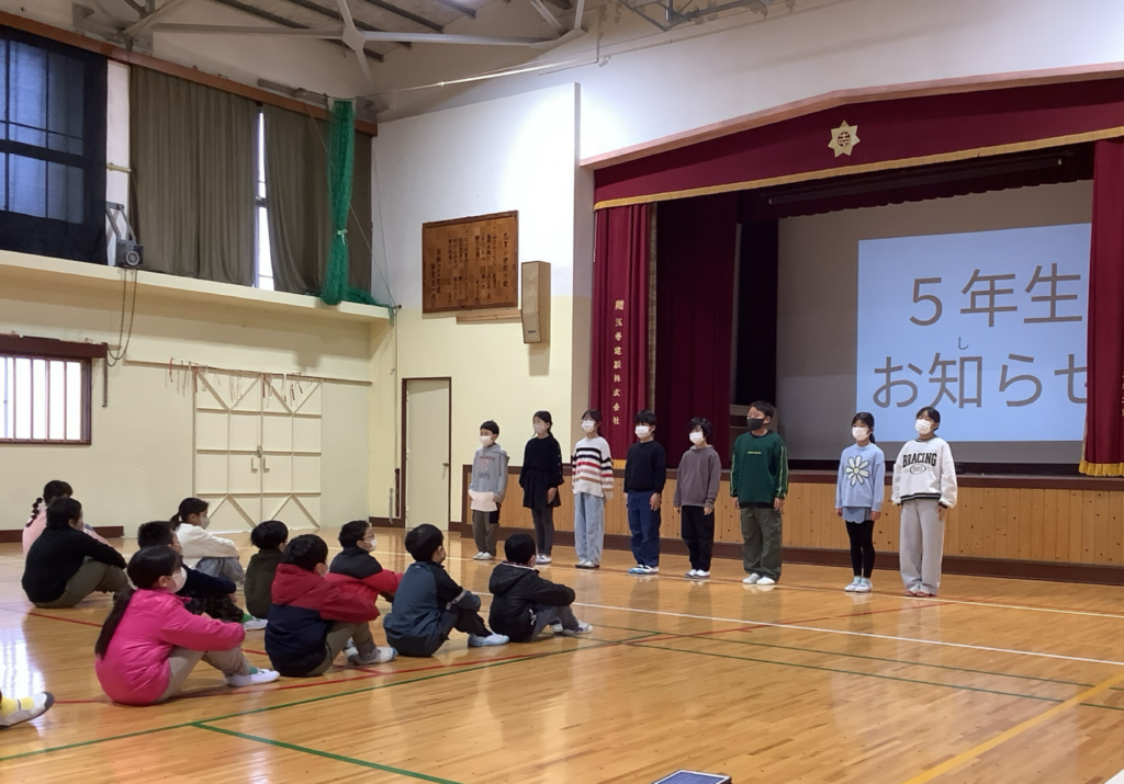 12月16日(火)に12月の児童朝会を行いました。まず、12月のお誕生会をしました。今回のインタビューは「冬に食べたいもの」でした。茶碗蒸しやおもちなど冬ならではの食べ物が出て、みんなうなづきながら聞いていました。また、5年生から「志賀っ子スマイル発表会」に向けてのお願いも発表されました。最後にお話を絵にするコンクール、ドッジボール大会、11月30日に行われた綾部市小学生駅伝競走大会の表彰式を行いました。