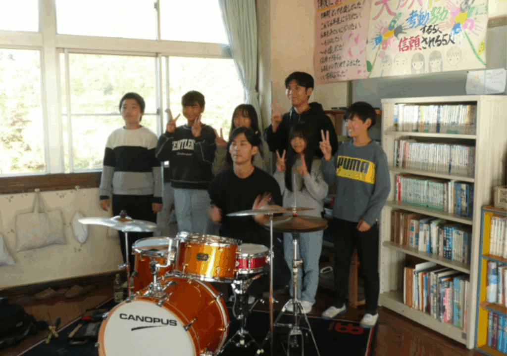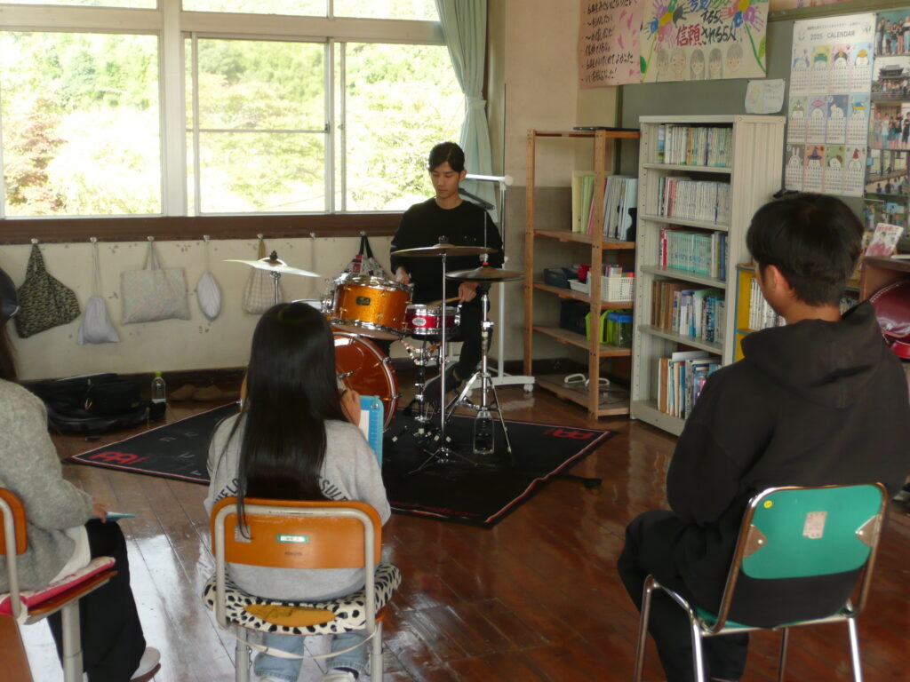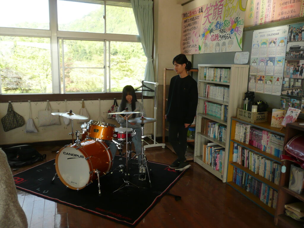 お話の中では、小学校時代に没頭したこと、中学校でドラムと出会ったこと、田舎で生まれ育って、「田舎だから」といってできないことはないという話、好きなことを全力でしてほしいという話等、子どもたちは食い入るように話を聞いていました。後半はドラム体験をさせていただきました。5人の子どもたちの呑み込みの早さに驚いておられました。