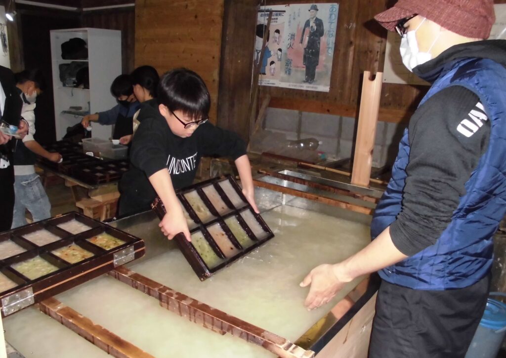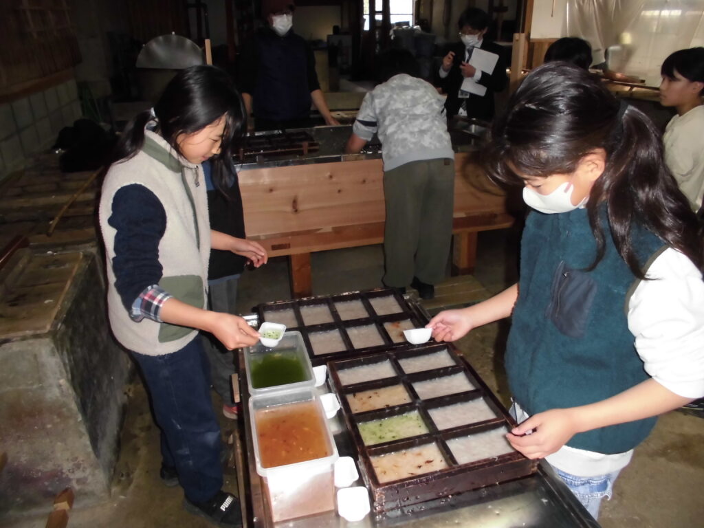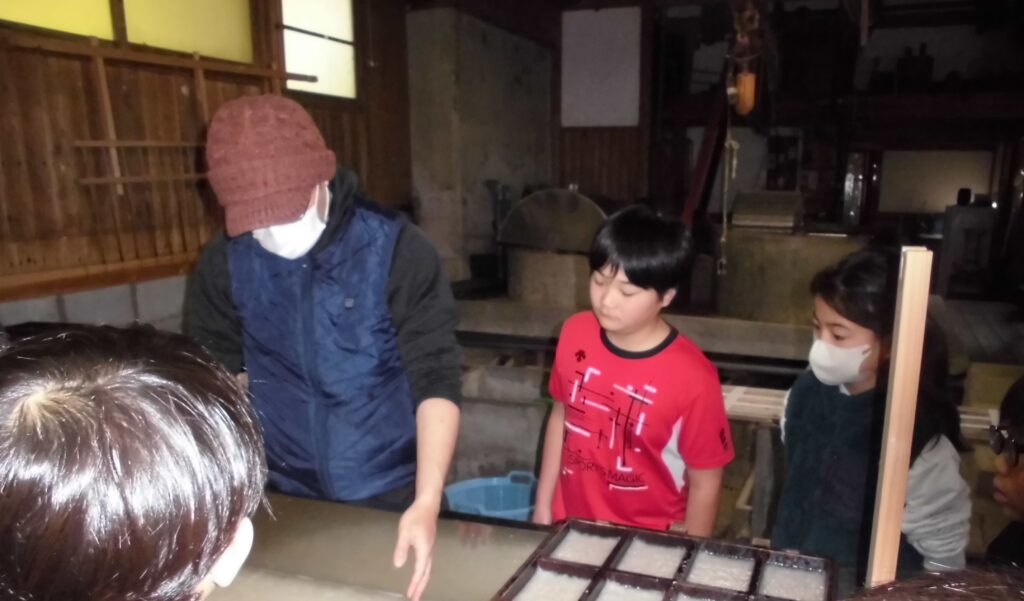 3.4年生社会科 ~黒谷で紙漉き体験~ 学校日誌 2026.02.27 3.4年生が社会科の学習で黒谷へ紙漉き体験に行ってきました。会館の方の話を熱心に聞き、驚きに歓声をあげながら、和紙作りに必要な材料の説明を聞いたり、和紙でできた物を見せてもらったりしました。後半は実際に紙漉きを体験しました。緊張の面持ちで紙を漉く子どもたちの姿が印象的でした。「今日、仕上がるんですか?」「できあがりが楽しみや。」と、自分で漉いた紙ができあがるのを楽しみにしていました。