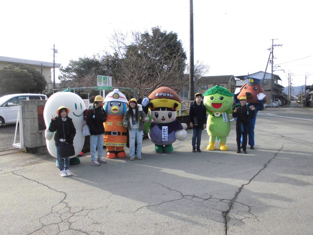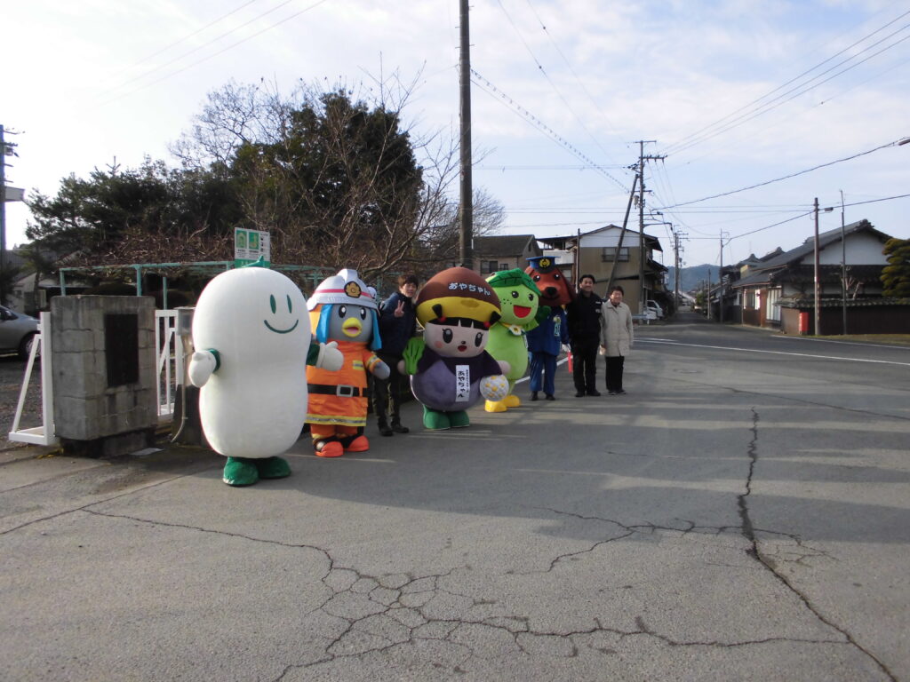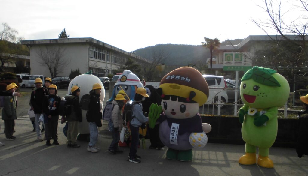 今日は「元気だよ志賀っ子の日」でした。PTA会長の発案で、最後のこの日に、子どもたちの「最幸の笑顔」につながるようにと、綾部市のゆるキャラを集めてあいさつ運動をしようということになりました。集合したゆるキャラは「まゆピー」「けしたくん」「あやちゃん」「はなちゃっぱ(何北ブロック)」「クウちゃん(物部駐在所)」などなどです。