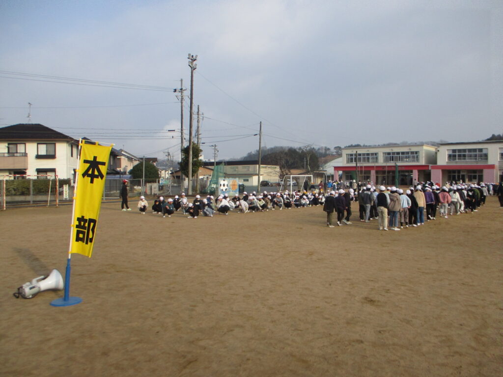 地震を想定した避難訓練を行いました。落ち着いて行動できる六人部の子どもたちです。