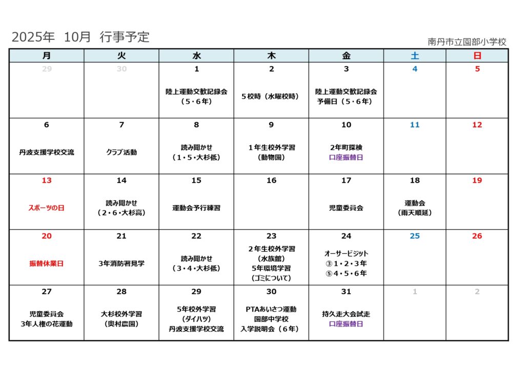 お知らせ 2025.10.082023.01.10 そ の べ っ 子 日 記 10/8 読み聞かせ絵本紹介2025年10月8日 10/7 駅伝練習スタート2025年10月7日 10/3 特訓中!2025年10月3日 6年生 陸上記録大会2025年10月1日 6年生 みんなで道徳学習2025年10月1日 9/29 色別応援練習2025年9月30日 食 育 の 取 組 10月8日(水)の給食 10月7日(火)の給食 10月6日(月)の給食 月 間 行 事 予 定