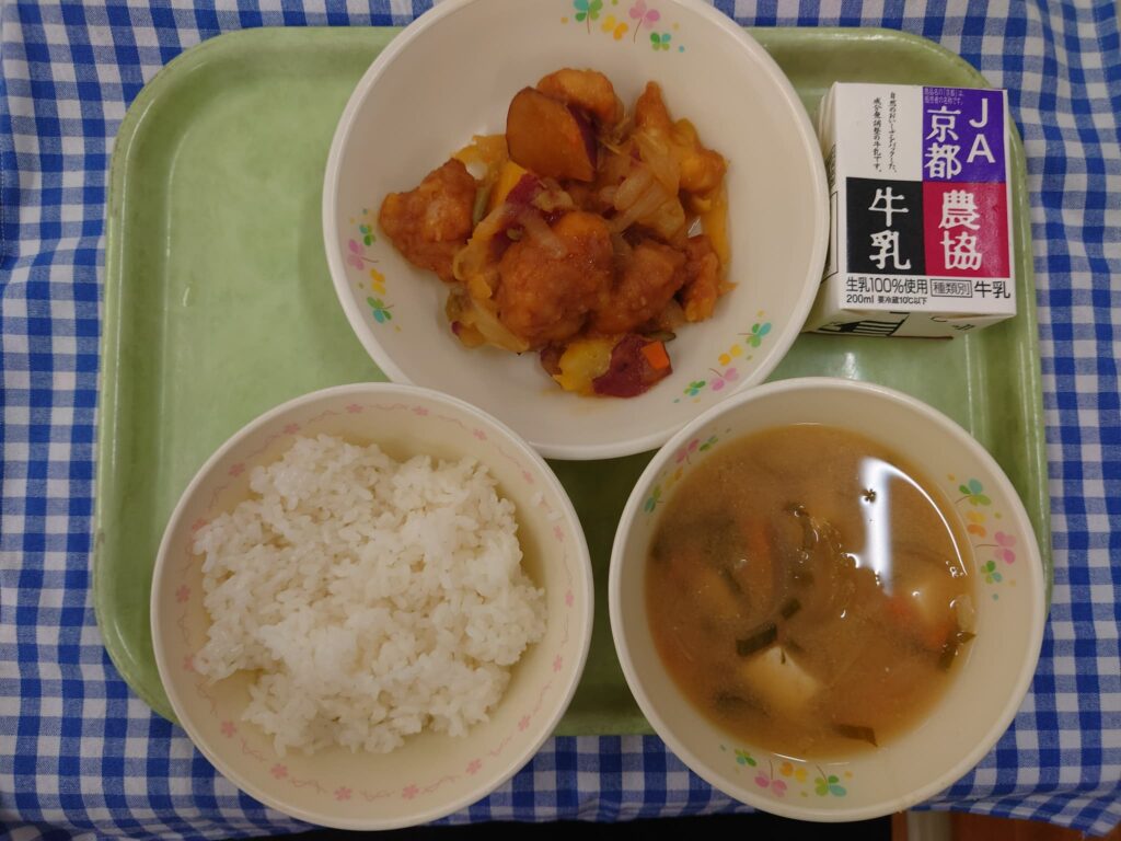10月6日(月)の給食 食育の取組 2025.10.06 ごはん 鶏肉とさつまいものうま煮 青ねぎのみそ汁 牛乳 今日は秋の味覚、さつまいもを使ったうま煮でした。さつまいもはでんぷんを多く含み、加熱することで糖質に変わり甘みが増します。また食物繊維やビタミンCをたくさん含むので、体の外も内もきれいにしてくれます。今日は鶏肉と一緒に煮込むことで、さつまいもの甘みが全体に溶け込み、子どもたちは「あまい!」と言いながら給食を食べていました。 Post Views: 23