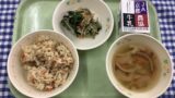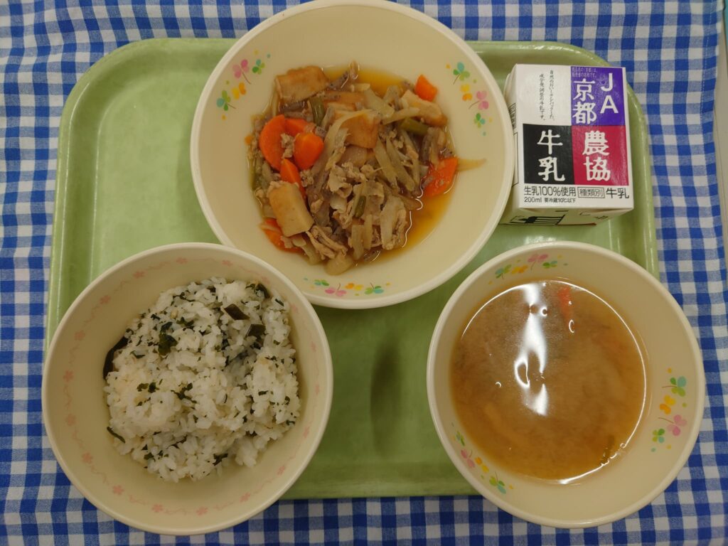 わかめごはん 豚肉とじゃがいもの炒め煮 玉ねぎのみそ汁 牛乳