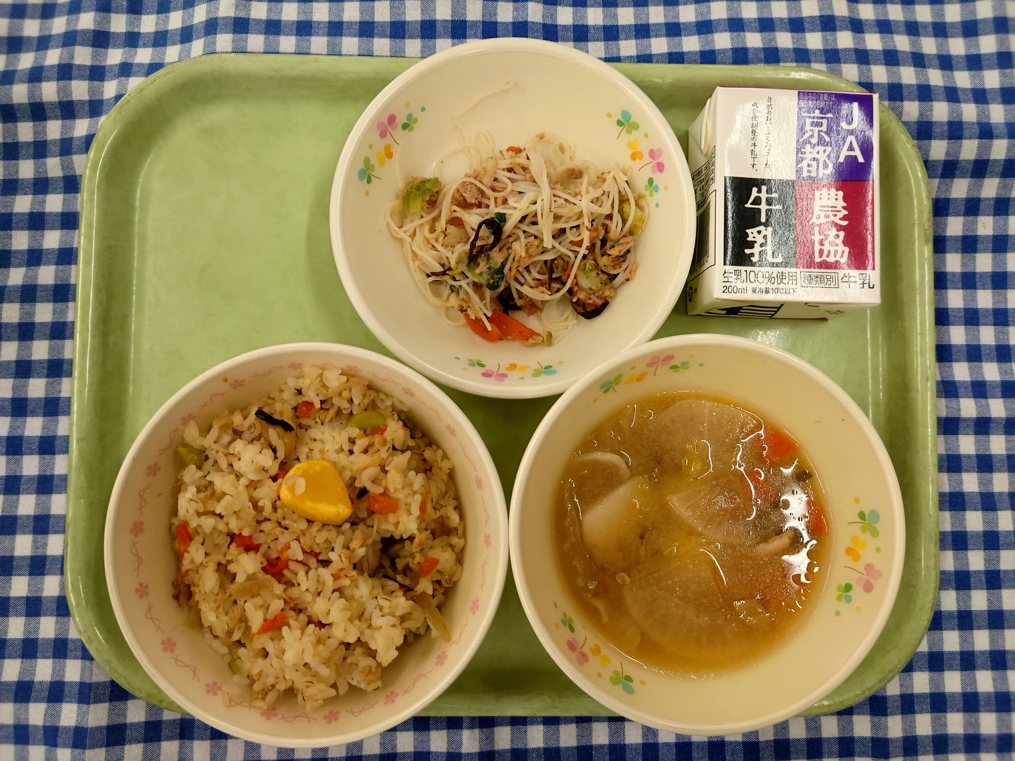 10月27日(月)の給食 食育の取組 2025.10.27 秋の味覚献立週間 秋の香りごはん ツナとビーフンの塩昆布和え 豚汁 牛乳 今日は秋の味覚をたくさん使った、秋の香りごはんでした。ごはんの中には、きのこ類(えのき、しめじ、しいたけ)、ごぼう、にんじん、そして栗といった秋が旬の食材が入っていました。子どもたちは「秋の香りがする!」「栗いっぱい入ってた!」といってたくさん食べてくれました。 Post Views: 28