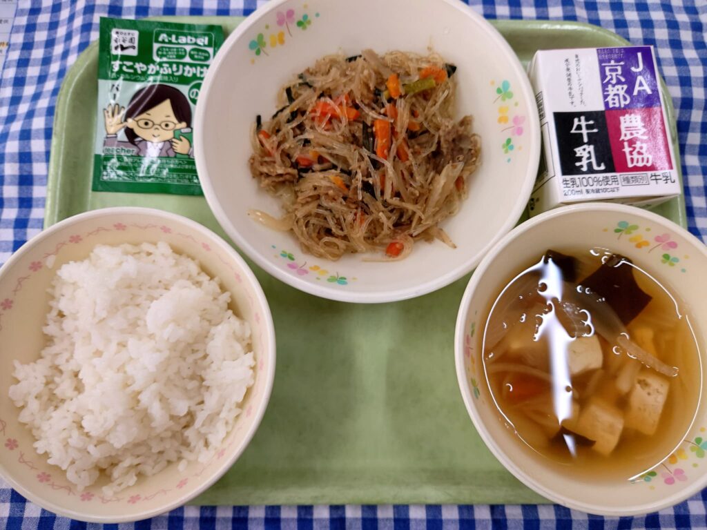 ごはん チャプチェ わかめスープ のりふりかけ 牛乳