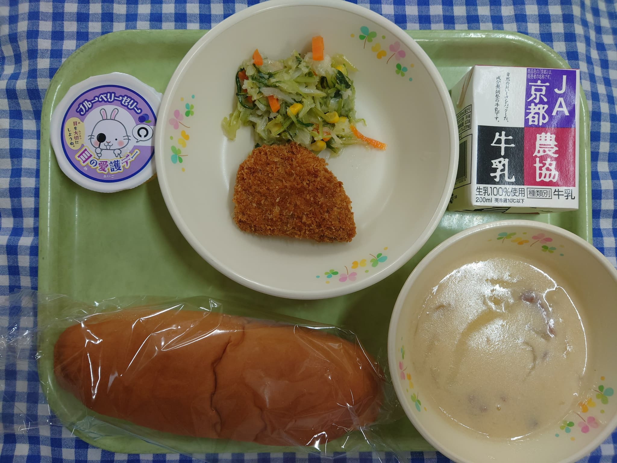 今日は10月のお誕生月献立でした。今日は年4回あるパンの日でした。子どもたちはパンを半分にし、ひき肉フライを挟んでみたり、小さくちぎってシチューにつけて食べたりといろいろな食べ方で楽しく給食を食べました。デザートにはゼリーもついており「ブルーベリーたべたらめがよくなるんやで!」と友達同士で教えながら食べていました。食事を楽しく食べることで、不思議と食べ物の味もおいしく感じることができますね。
