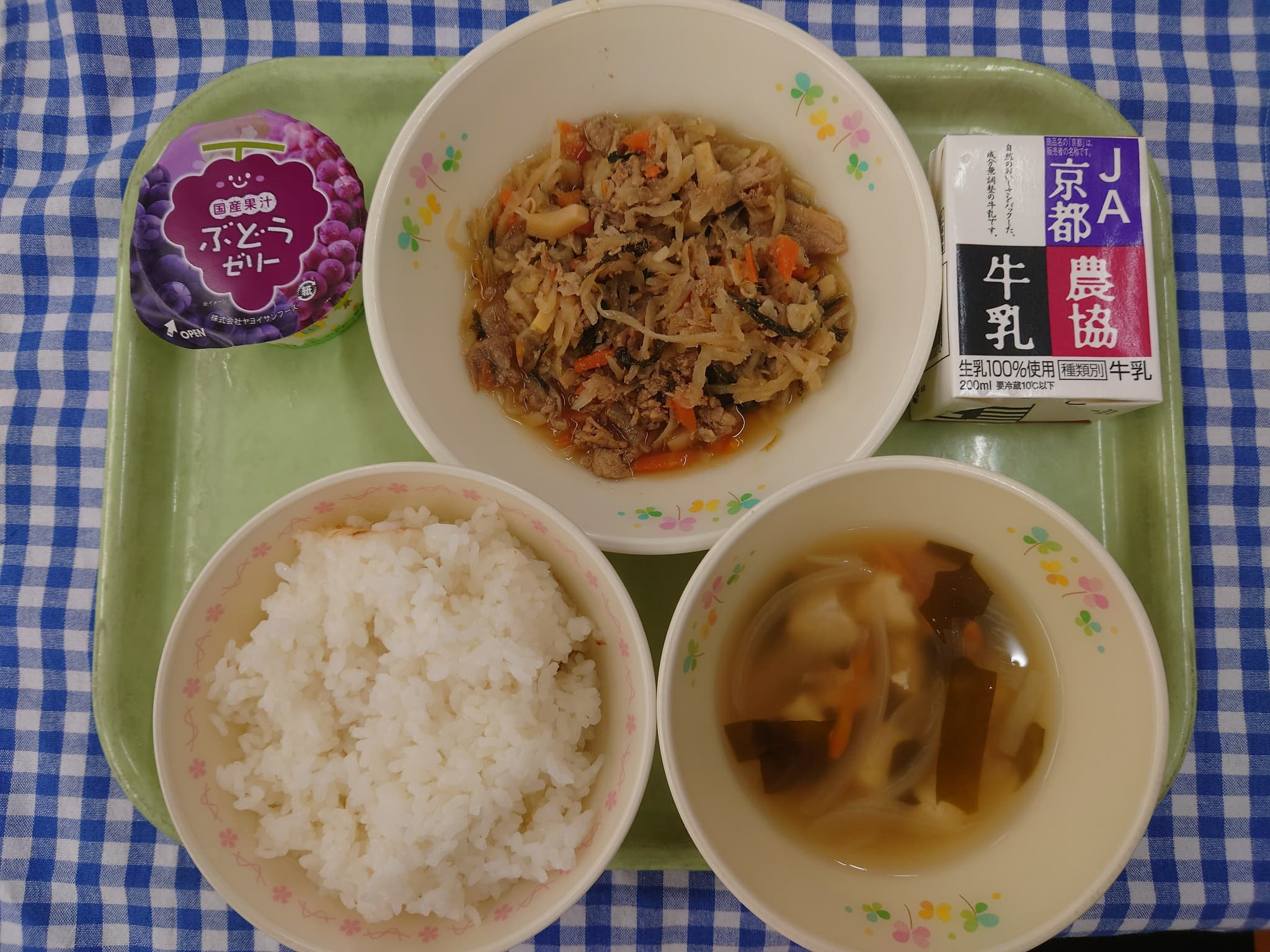 ごはん かみかみビビンバ 豆腐とわかめのスープ ぶどうゼリー 牛乳