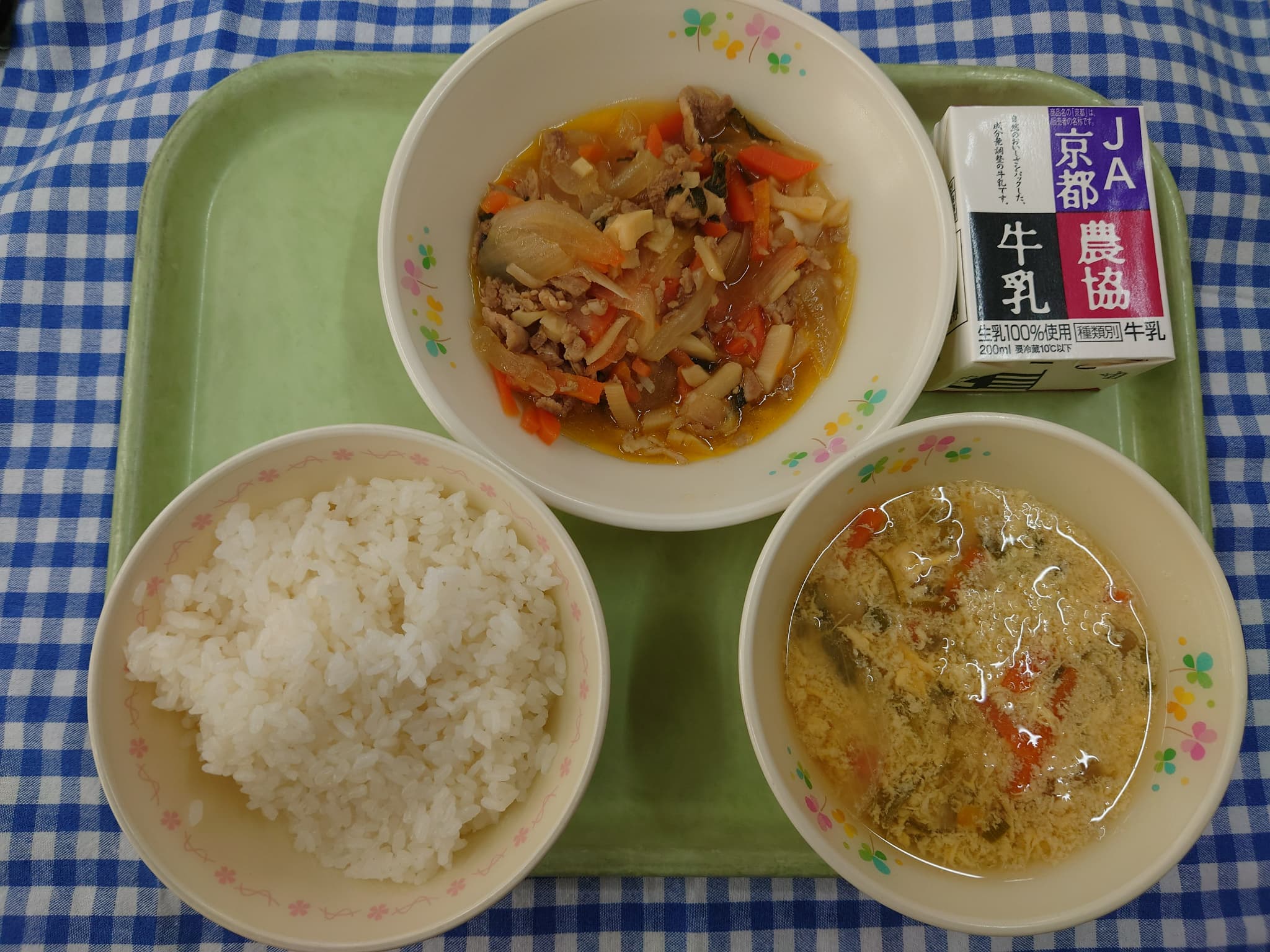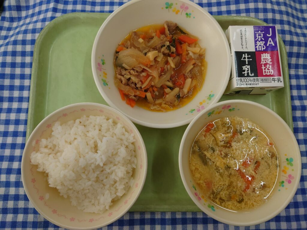 ごはん 豚肉の甘辛炒め かき玉汁 牛乳