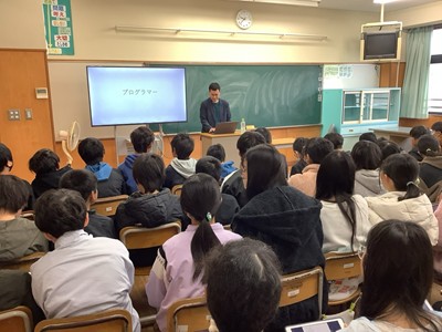 1人目はプログラマーの方です。実際の仕事の内容や、プログラミングが生活の中でどのように活用されているかを紹介していただき、子どもたちは興味津々で耳を傾けていました。
