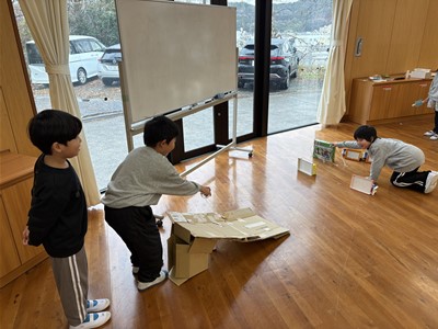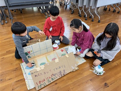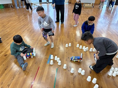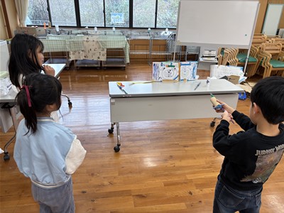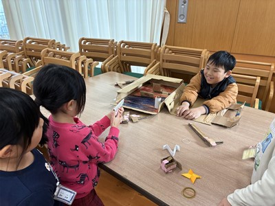 1・2年生 おもちゃランド 1年生 2025.12.18 2年生の生活科「せかいでひとつ わたしのおもちゃ」の学習で、ふれあいホールに「おもちゃランド」をひらきました。これまでに、1年生に楽しんでもらうためにおもちゃの改良を重ねたり、よろこぶ景品を作ったりと準備を頑張ってきた2年生。本番では、1年生に遊び方を一生懸命に説明し、優しく接していました。「楽しかった!」という1年生の言葉に、2年生の表情も達成感でいっぱいなりました。 Post Views: 41