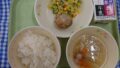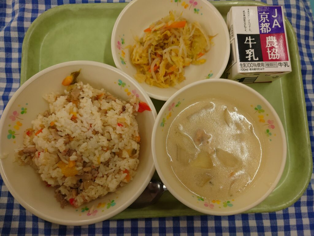 カラフルピラフ じゃこサラダ かぶの豆乳シチュー 牛乳