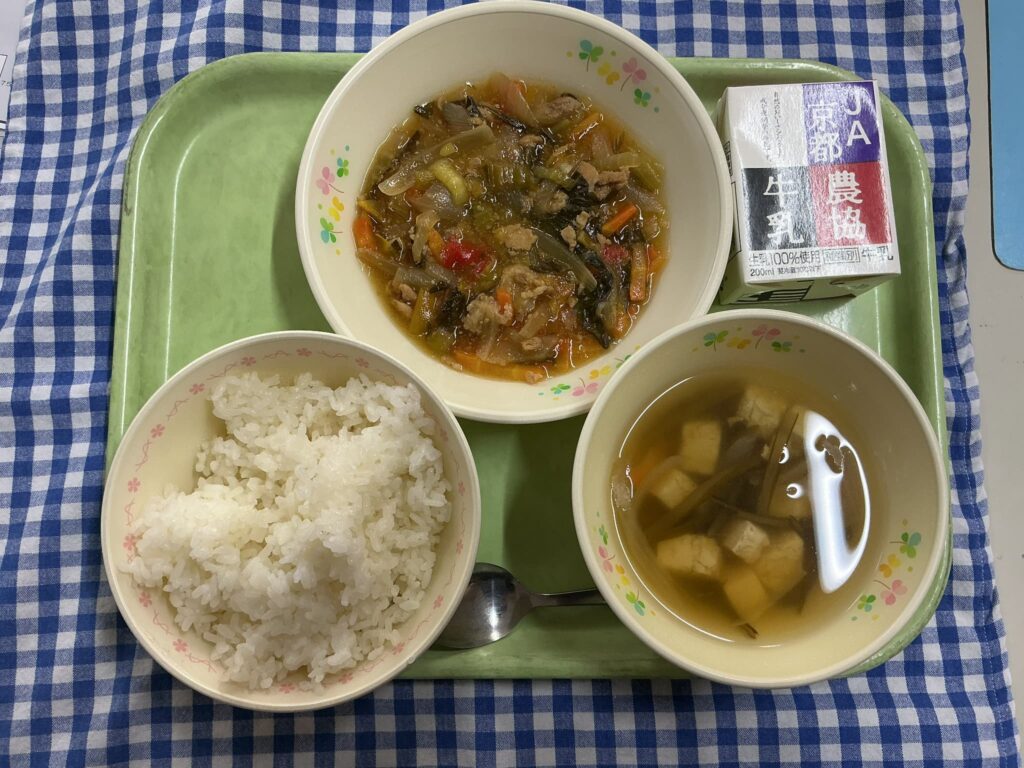 カルシウムと言われると牛乳などの乳製品を思い浮かべますが、実は海藻や野菜、特に葉物野菜である青菜にもカルシウムは含まれています。動物性(乳製品など生き物からとれるもの)に比べると、植物性(大豆製品や海藻、青菜などの植物からとれるもの)はカルシウムの吸収率は少し下がってしまいますが、料理に合わせやすく、手軽にカルシウムを補給することができます。食育の授業や給食の時間に子どもたちに話すと「そうなんや~」と初めて知る子がいたり、「知ってるよ!」「毎日食べてる!」とカルシウムの入っている食べ物をたくさん知っている子もいました。今日は2年生と3年生の給食の様子です。