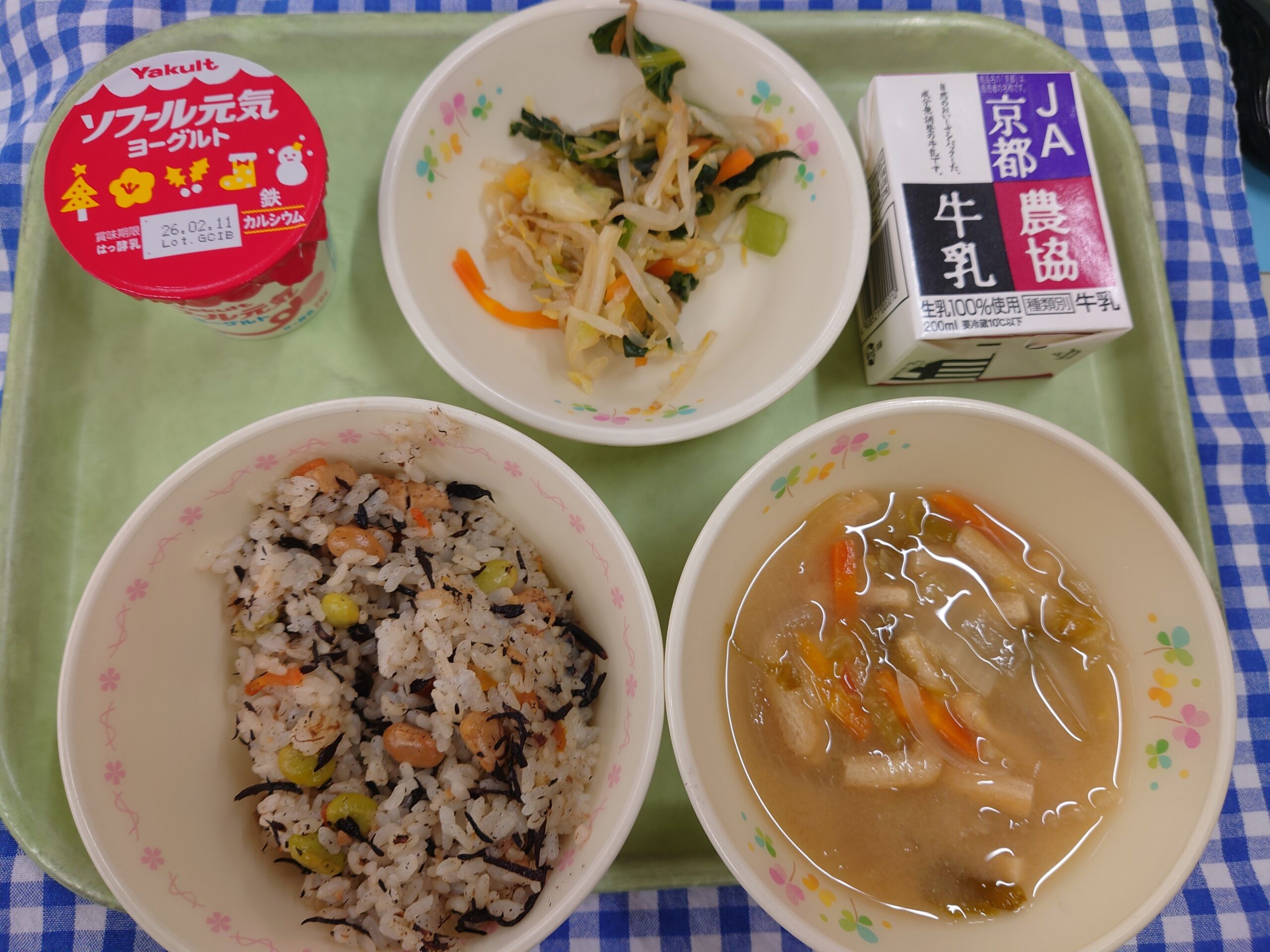 ひじき豆まめごはん 小松菜のおひたし 白菜のみそ汁 牛乳
