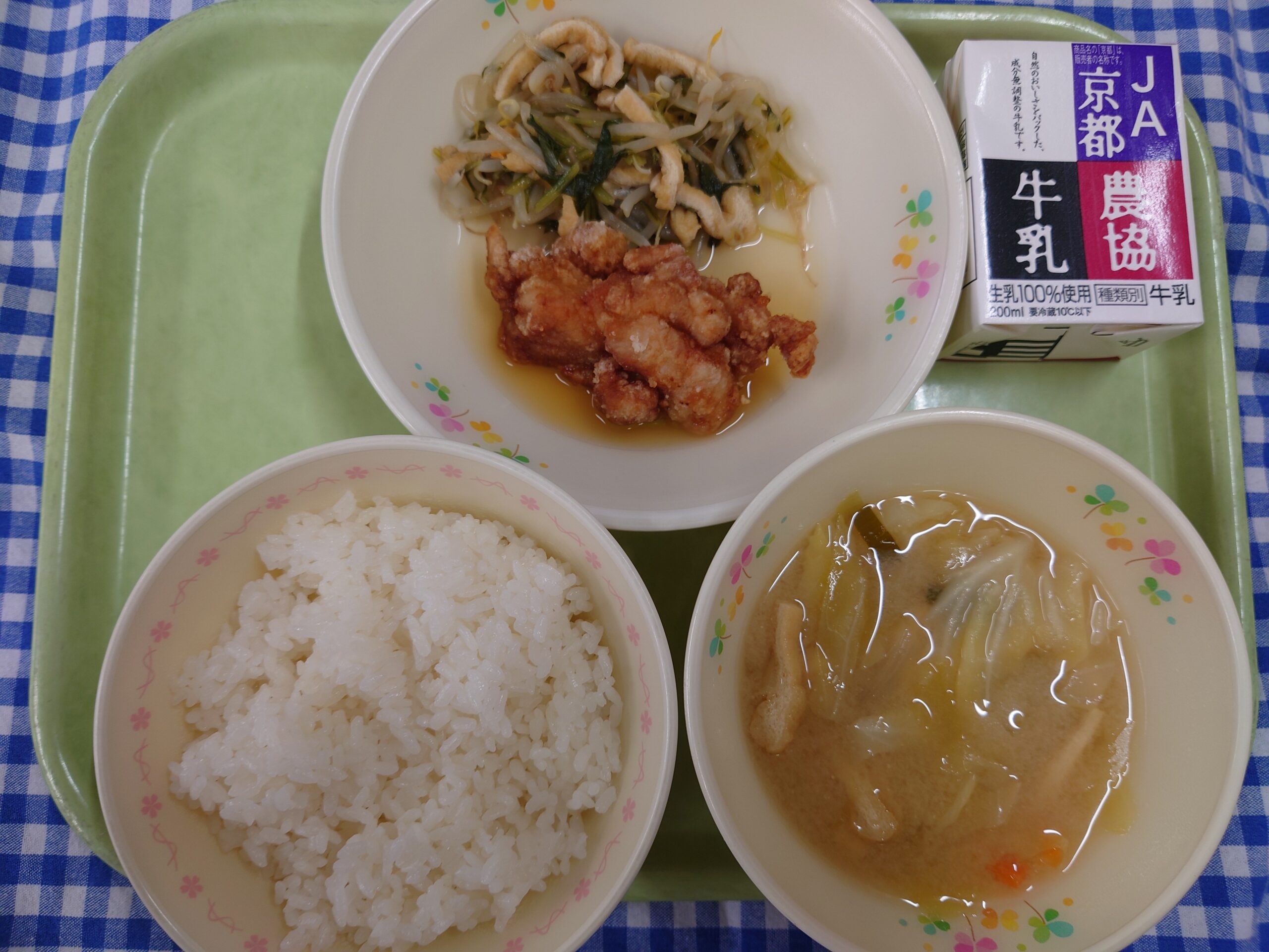 ごはん ☆鶏肉のレモンソースがけ もやしの煮びたし きゃべつのみそ汁 牛乳