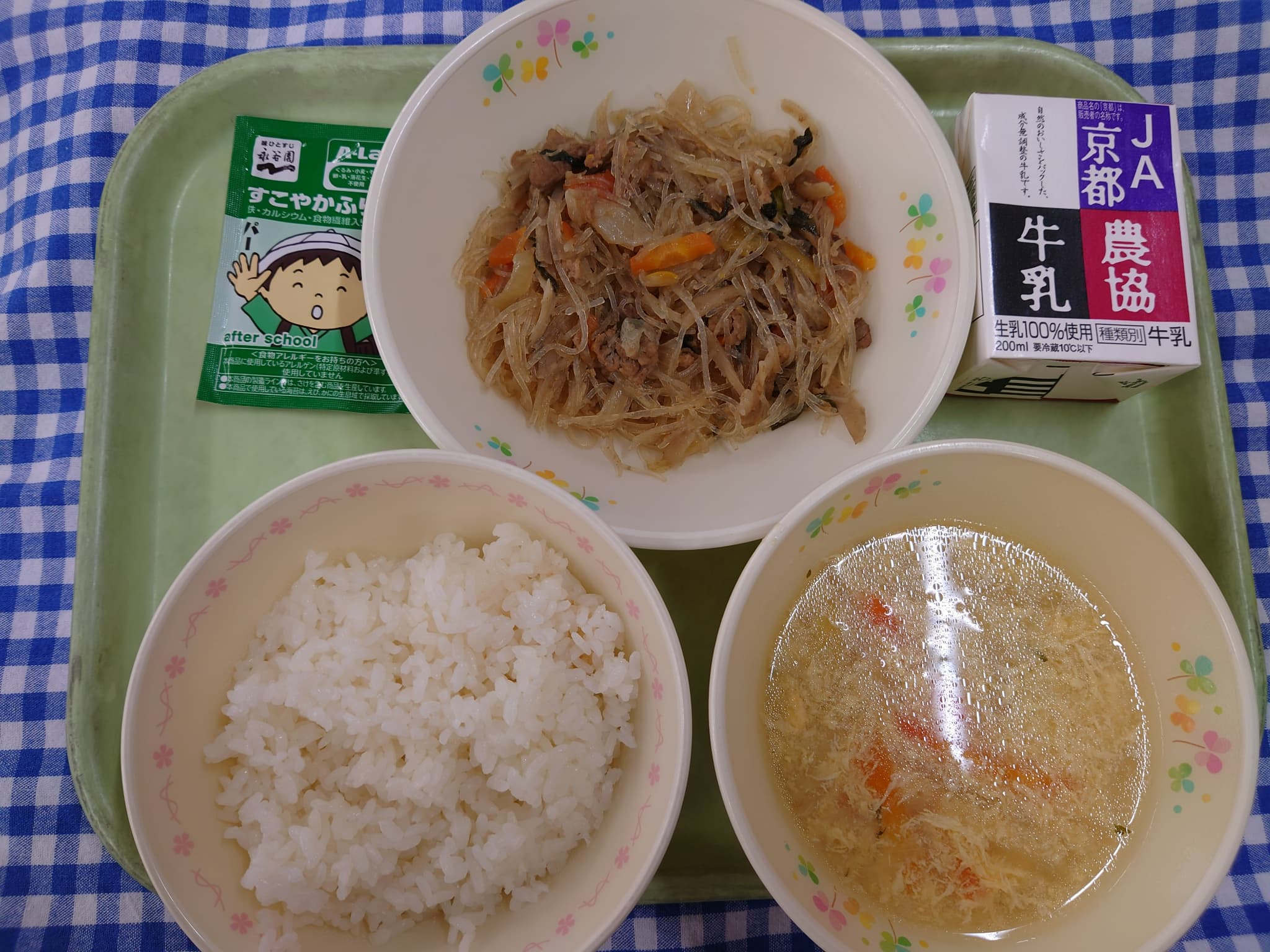 ごはん ☆チャプチェ ふわふわ卵スープ のりふりかけ 牛乳