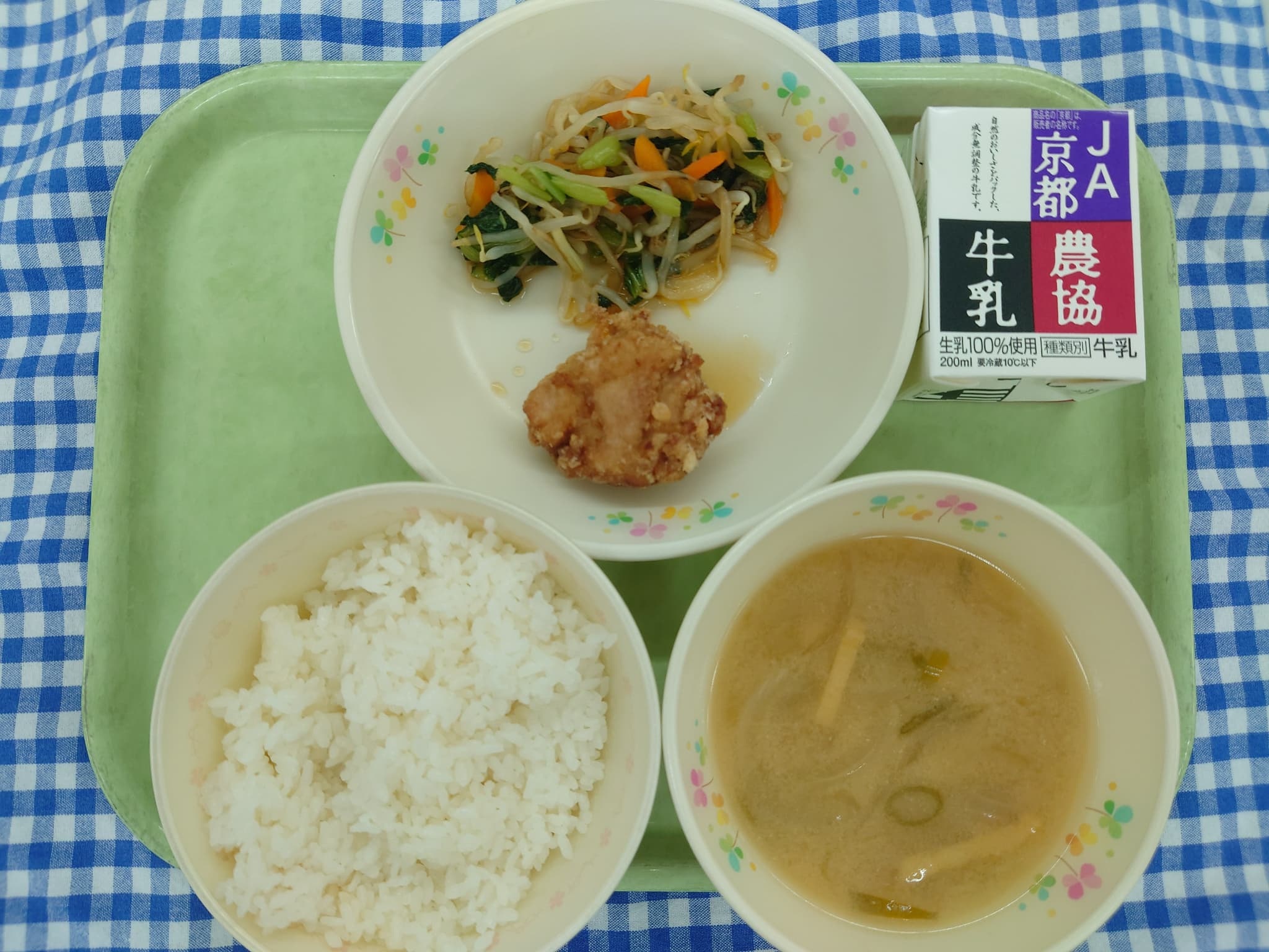 ごはん 鶏肉のから揚げ 小松菜のおひたし 油揚げのみそ汁 牛乳