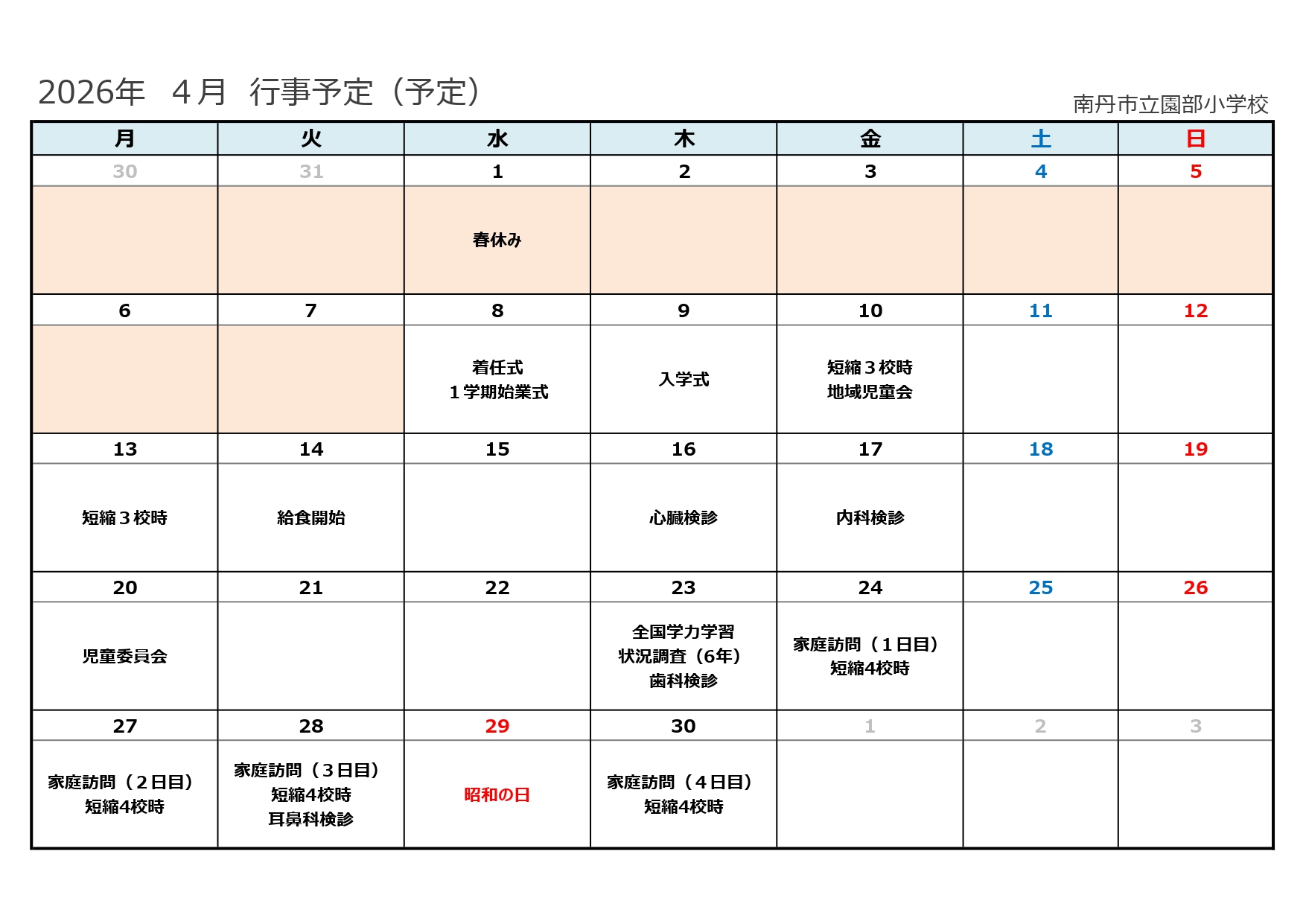 学校行事 月間予定