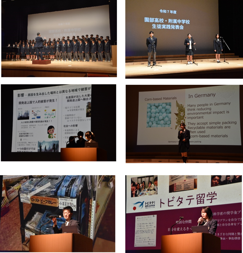 令和7年度 生徒実践発表会 園高NEWS 2026.02.25 2月5日(木)、令和7年度園部高校・附属中学校生徒実践発表会を開催しました。本会では、生徒たちが授業やその他の活動において年間を通じて取り組んできた成果を発表し、共有しました。発表には、附属中学校3年生、高等学校1年生及び2年生の生徒が参加しました。 どの発表もこれまでの成果が大いに発揮されており、会場は拍手の渦に包まれました。 Post Views: 121