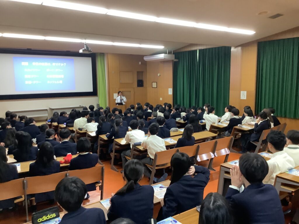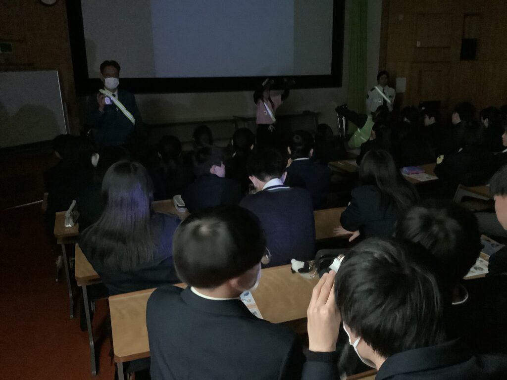 4月13日(月)、南丹警察署の方にお越しいただき、新入生に向けて交通安全についての御講演をしていただきました。今年の4月から自転車にも青切符が切られるようになり、自転車の乗り方や交通ルールについて重点的に話していただきました。特に1年生は今までとは異なる通学方法となりますので、事故に気を付けて安全に登校しましょう。