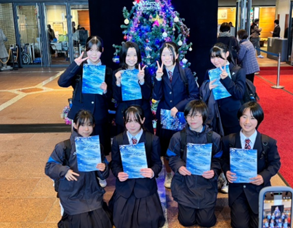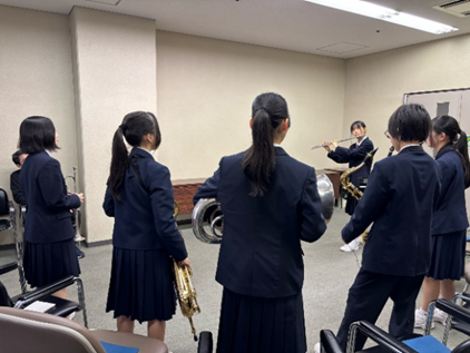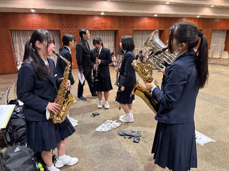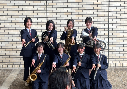 12月21日(日)八幡市文化センターにて「第58回京都府アンサンブルコンテスト」が開催されました。本校からは、重面早希(フルート)、山下紗彩(クラリネット)、谷真裕香(アルトサックス)、横田晴翔(テナーサックス)、湯浅安珠(バリトンサックス)、田井香乃花(トランペット)、犬石ゆら(ユーフォニアム)内藤正太(パーカッション)の2年生8名が出場し、管打8重奏『風の詩(福島弘和 作曲)』を演奏しました。