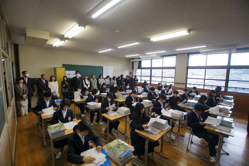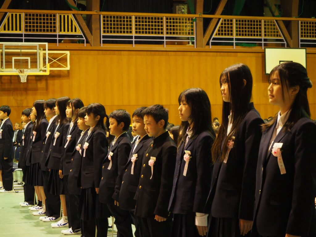 令和8年4月10日、南丹市立園部中学校入学式を挙行いたしました。あいにくの雨模様となりましたが、112名の新入生は、新しい先生や仲間と出会い、はじめの第一歩を踏み出しました。式では、吹奏楽部の演奏に加え、在校生、保護者、来賓の皆様の温かい拍手に迎えられ、入場しました。担任の先生からの呼名に、1人1人が元気よく返事をしていました。校長先生の式辞のあと、在校生代表からの歓迎の言葉に続いて、新入生代表の力強い誓いの言葉で締めくくられました。
