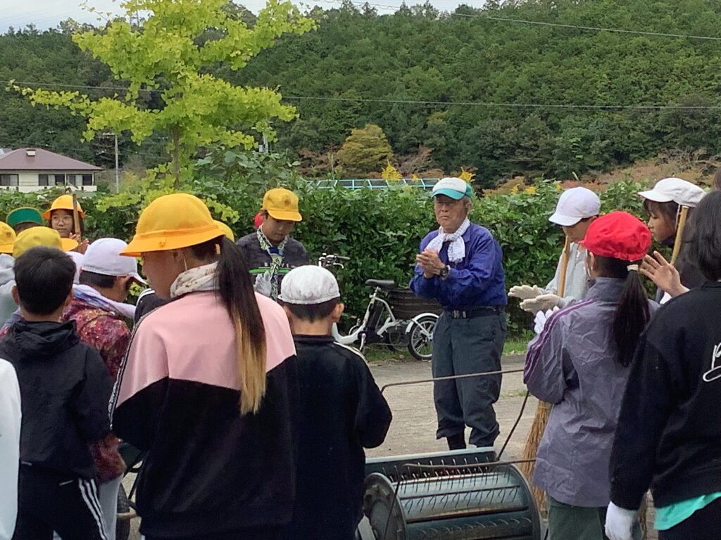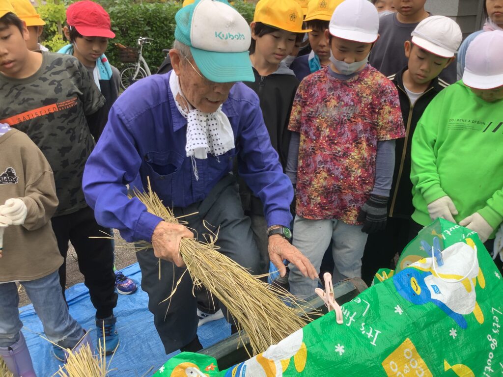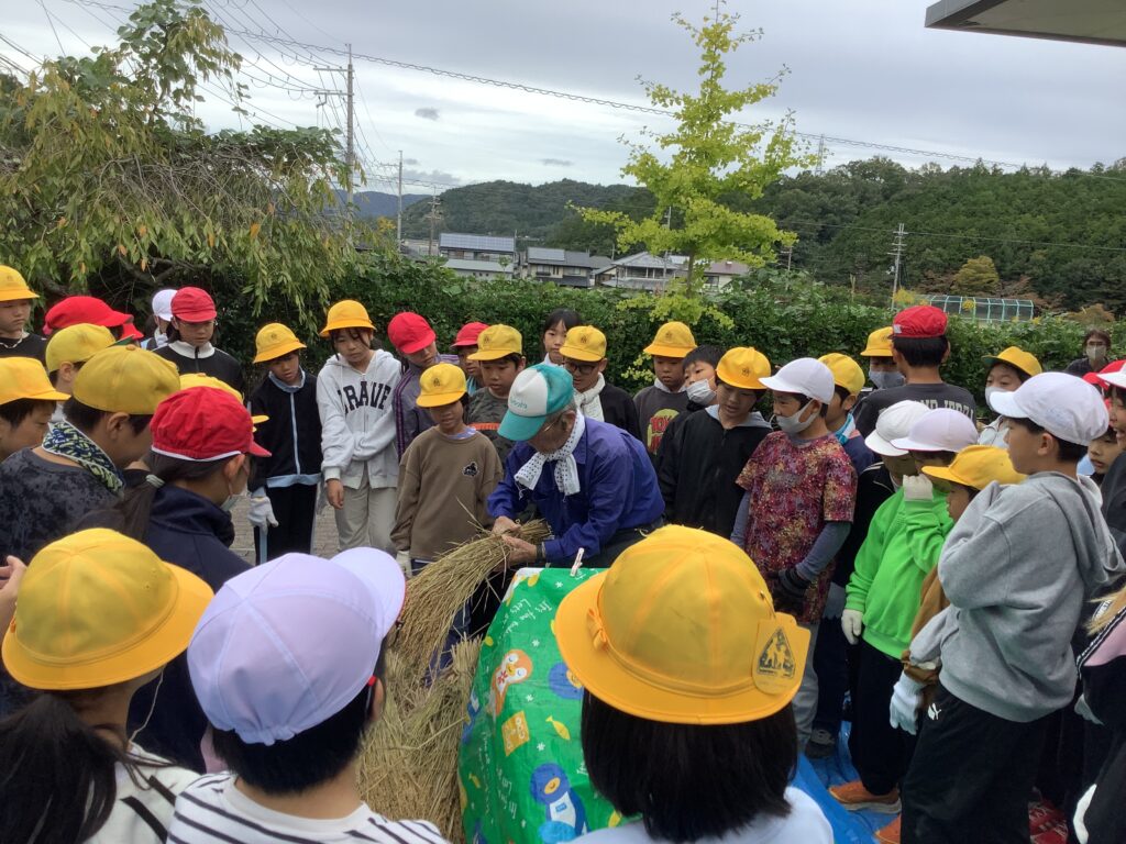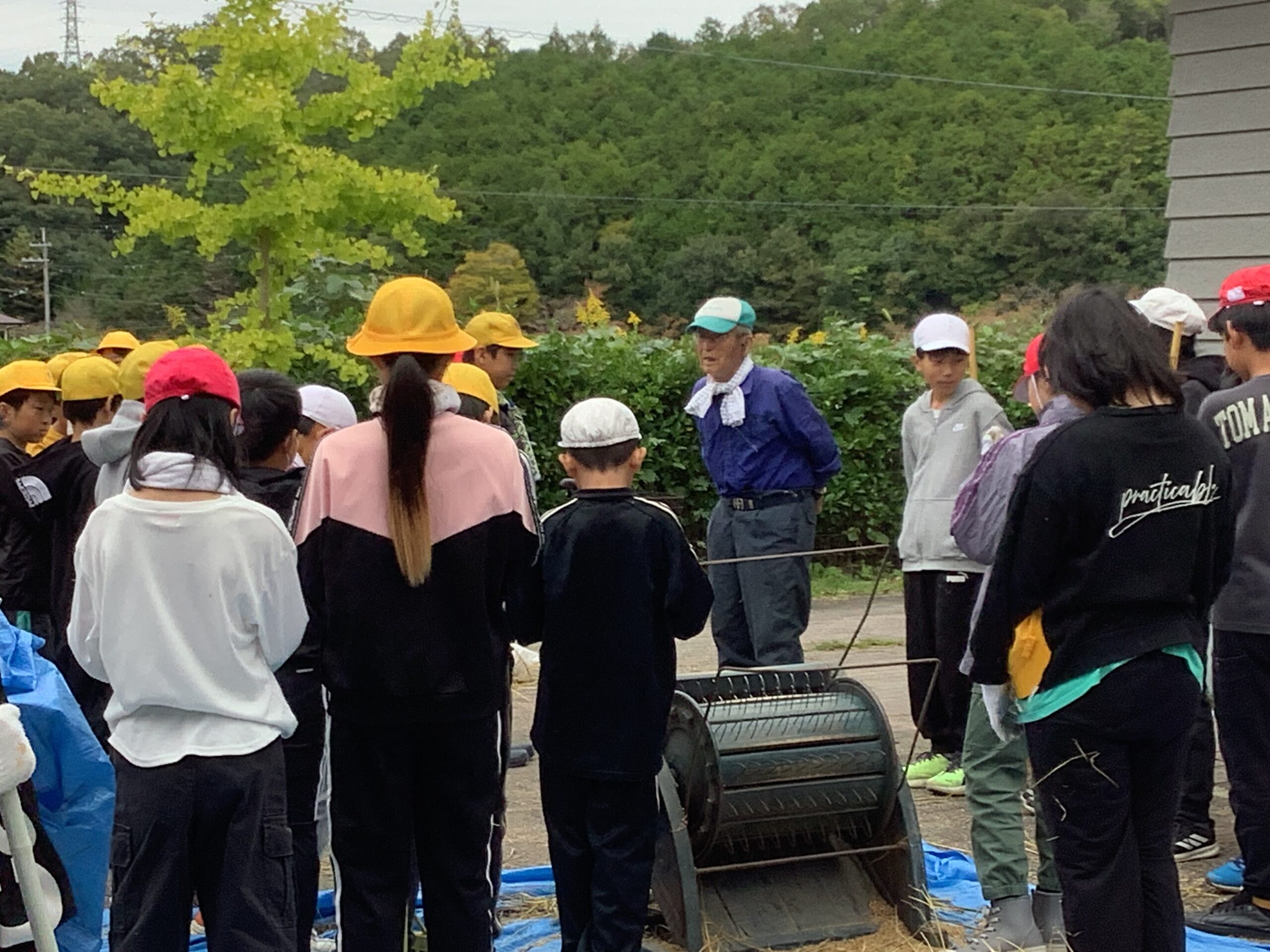 9月30日にみんなで刈り取った稲を、昔ながらの道具を使って、脱穀をしました。 初めて見る道具に、「どんなふうにするのだろう」とみんな興味津々です。田植えや稲刈りをずっと教えていただいた 地域の方からアドバイスを受けながら、足踏み式の脱穀機や唐箕などの道具を使って一束ずつ、稲からモミを外していきました。 リズム良く足を踏んで、脱穀するのですが、結構力がいったりうまく機会が回らなかったりします。昔のお米作りの大変さや苦労を実感しました。脱穀した米はこのあと精米し、後日、家庭科の授業などで食べることにしています。楽しみです!!