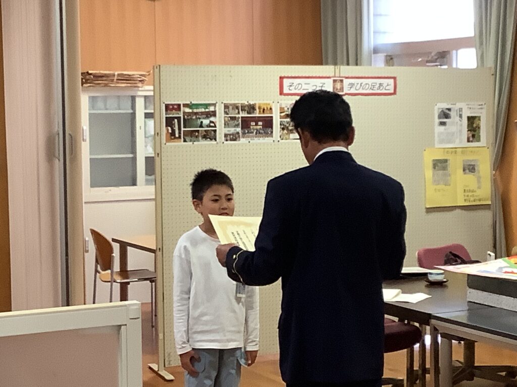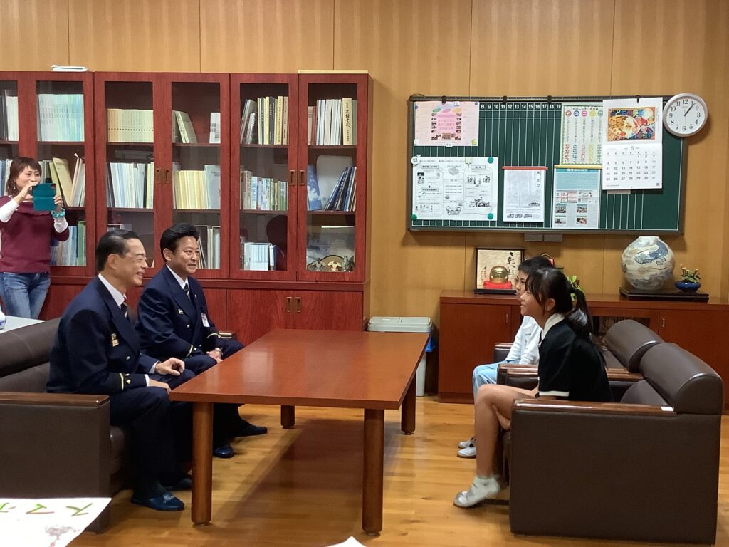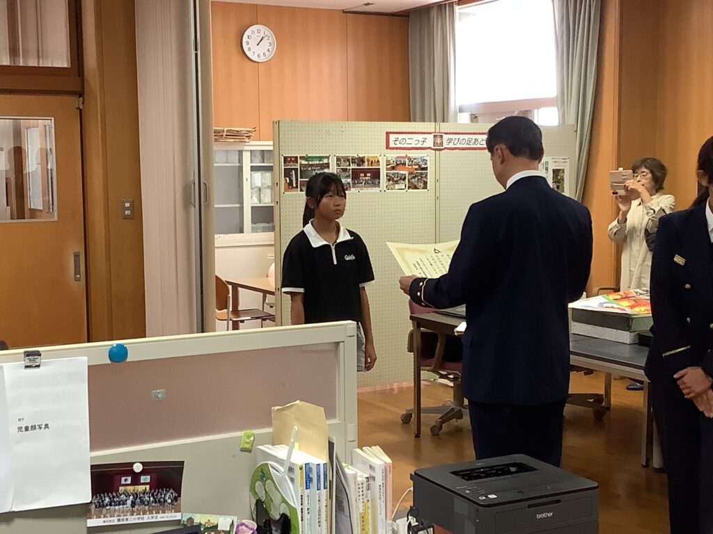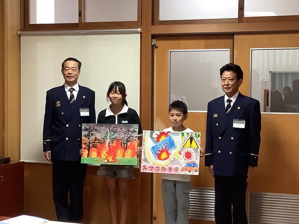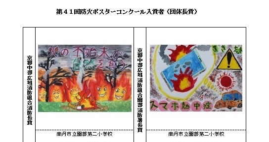 園部消防署主催の41回防火ポスターコンクールで本校の児童2名が入賞しました。10月27日に園部消防署の方が来校され、校長室で表彰式を行いました。消防署の方からは、「山火事やモバイルバッテリーからの出火などニュースで報道されていた火災をテーマにしていること」や「見る人に防火を呼びかけるメッセージが伝わっていること」など、2名の作品の良さをお伝えいただきました。夏休みにじっくりと作品作りに取り組んだ児童にとっても、大きな自信につながったと思います。