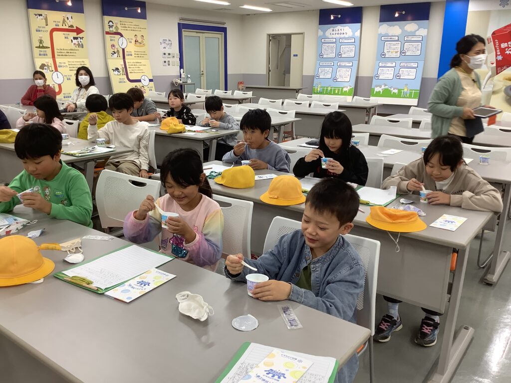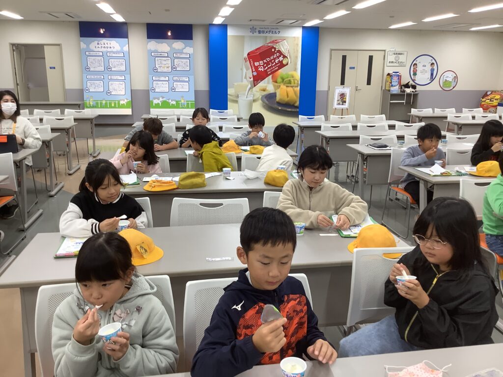 見学の最後には、工場で製造されたヨーグルトを試食させていただきました。「このヨーグルト知ってる!」「いつも食べてるやつや!」という声が聞こえていました。「おいしいなあ!」「ゆっくり味わって食べるわ!」「今日、これ買ってもらうわ!」など友達と話しながら、嬉しそうに試食していました。