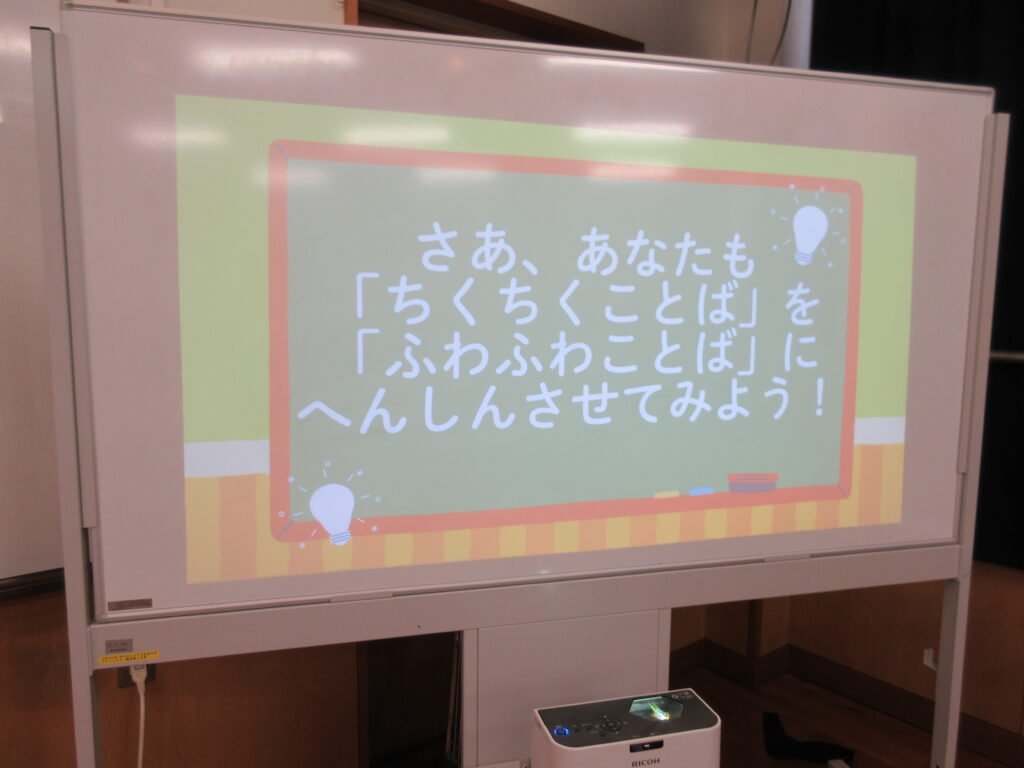 「ふわふわことば」と「ちくちくことば」があり、「ふわふわことば」を使う方がよいということは、みんな分かっていました。しかし、つい「ちくちくことば」がうかんでくることがあります。そんなとき、どうしたらよいか・・・「ちくちくことば」を「ふわふわことば」に変身させる!!