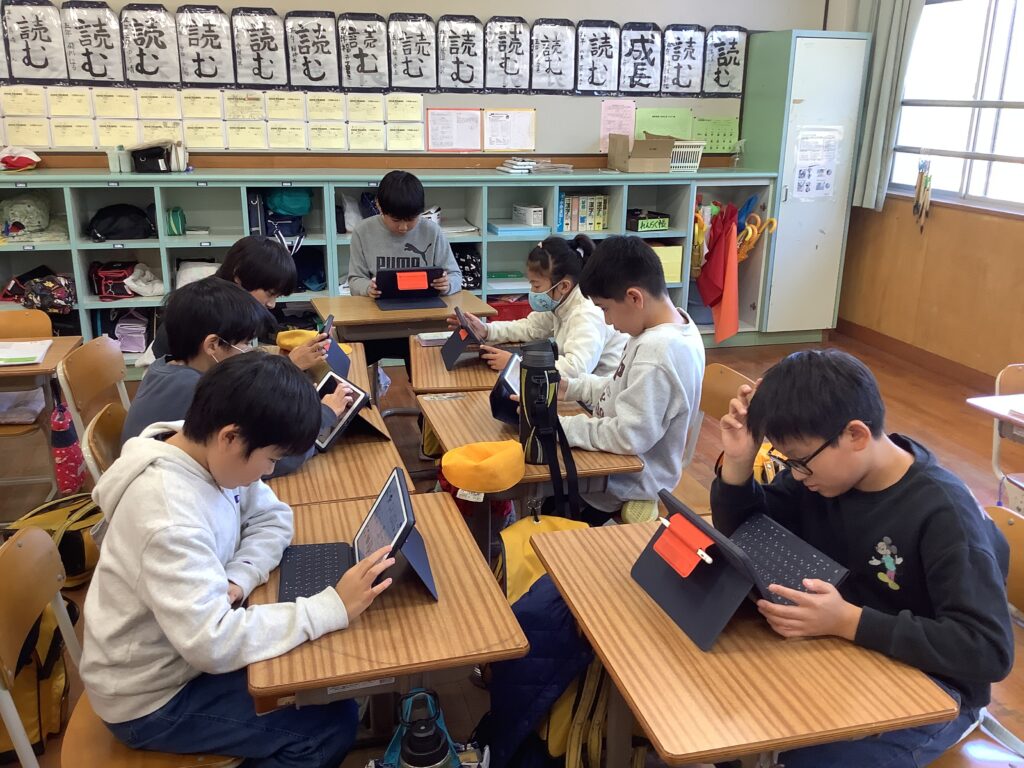 3階の教室では、何やら集中モードの子どもたちが。こちらは映像クラブです。今回のテーマは「自分の1日の生活の紹介動画をつくろう!」ということで、自分たちで必要な素材を集めて編集し、動画作成をしていました。見せ合い、アドバイスをし合いながら楽しんでいました。