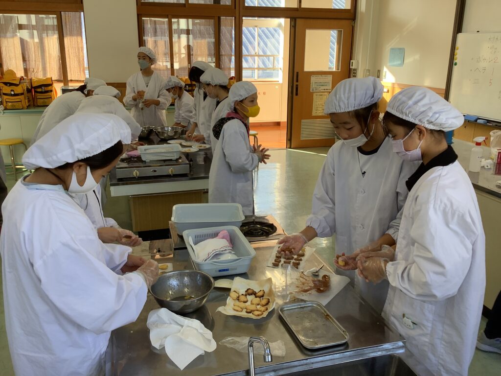 廊下を歩いているといい匂いが、、、。引き寄せられるように家庭科室へ行くと家庭科クラブがクッキーづくりに挑戦中。生地を絞り出したり、手で形作ったりして、見た目にもこだわる姿がありました。クラブ後「おいしかったー!」と教えに来てくれました。