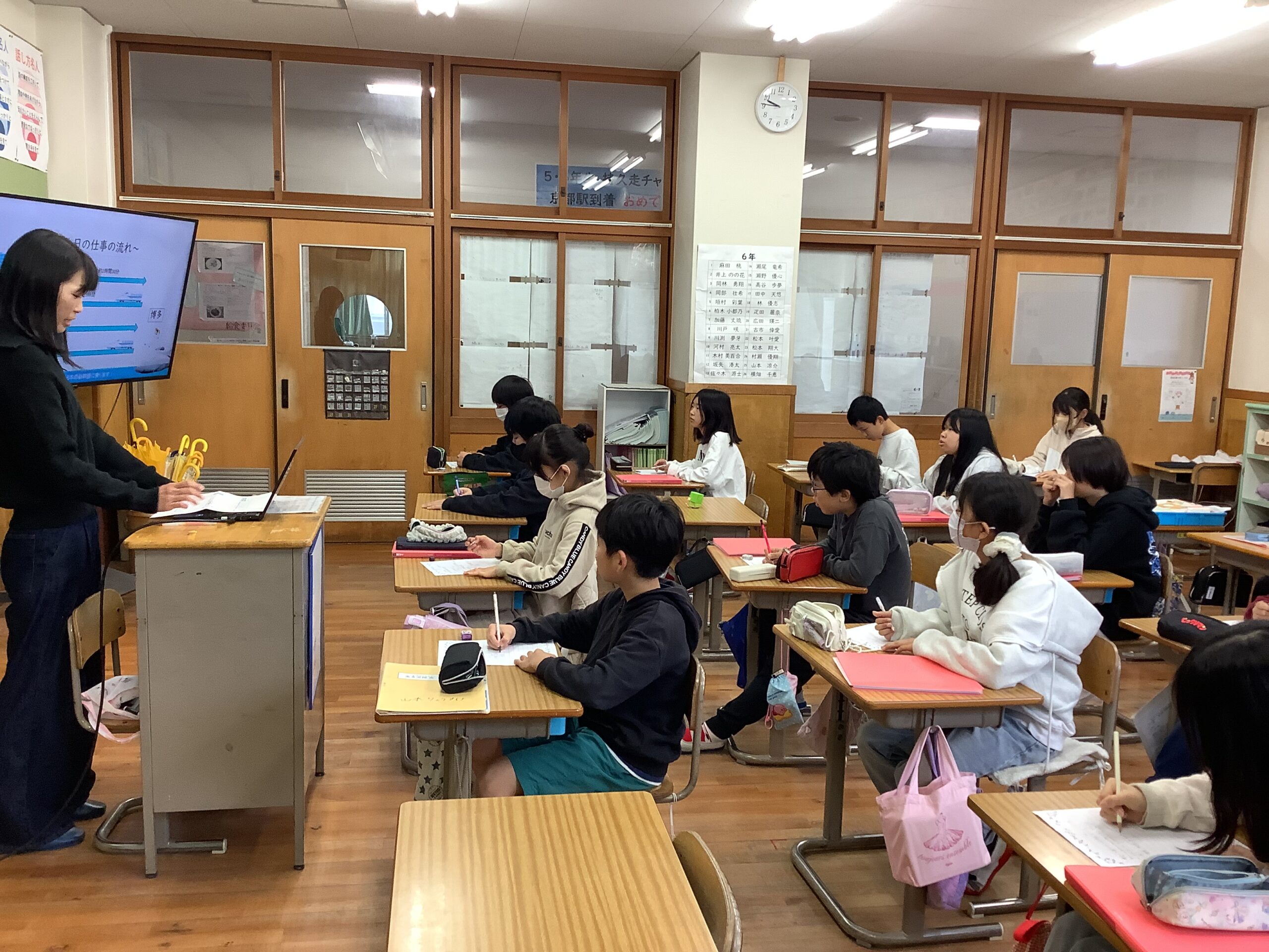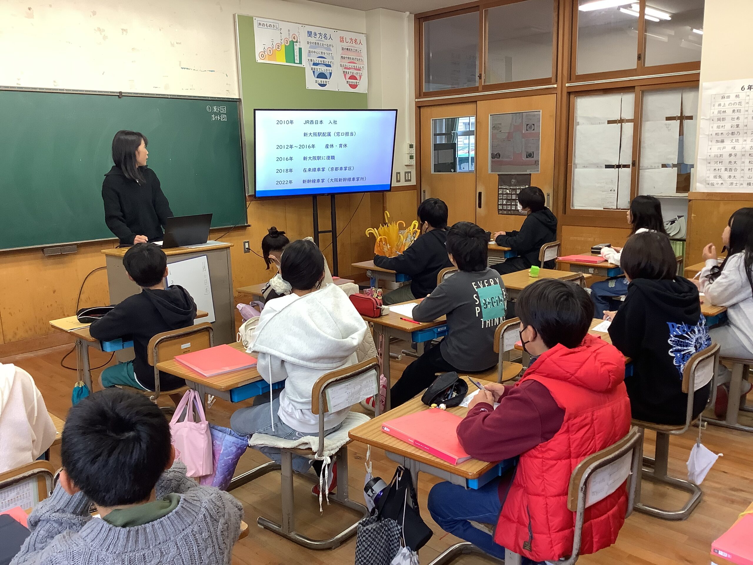 11月7日、キャリア教育の一環として、園部第二小学校の保護者の島崎さん(新幹線の車掌)をお招きし、お話をしていただきました。仕事のやりがいや、お客様を安全に目的地まで送り届けるために大切にしていることなどを、実体験を交えてわかりやすく話してくださいました。子どもたちは、普段見ることのできない仕事の様子や、心がけに興味をもち、真剣に耳を傾けていました。働くことの意味や、自分の夢について考えるきっかけとなる、貴重な時間になりました。