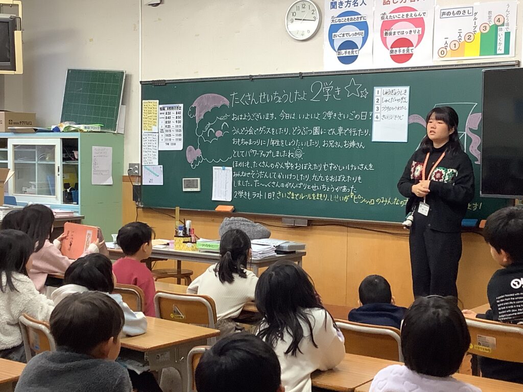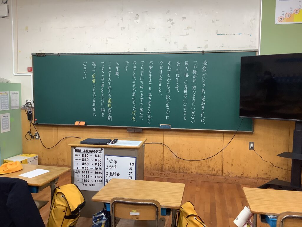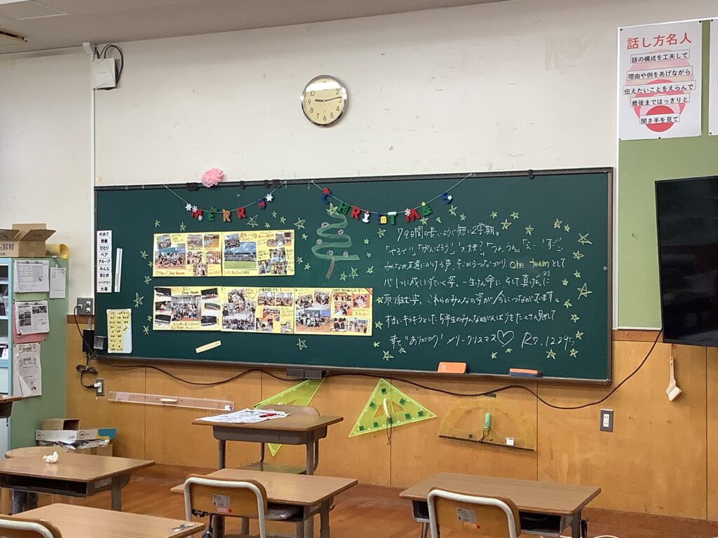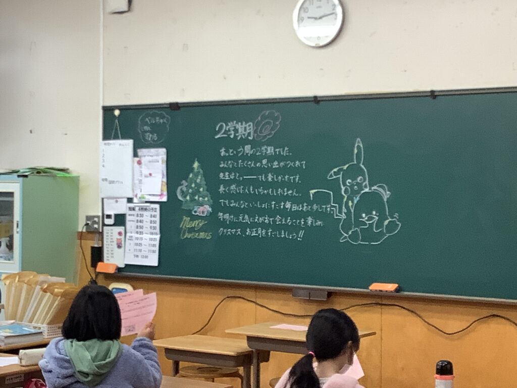 12月24日は2学期の終業式でした。終業式では、2学期を振り返り頑張ったこと振り返りました。進んで手を挙げて、全体に発表してくれた児童が何人もいました。また、「1年の計は元旦にあり」新年を迎えるにあたり、何か一つ自分で目標を決めようと話がありました。終業式後、教室で、一人一人に担任から頑張ったことを伝えながら、通知表を手渡しました。