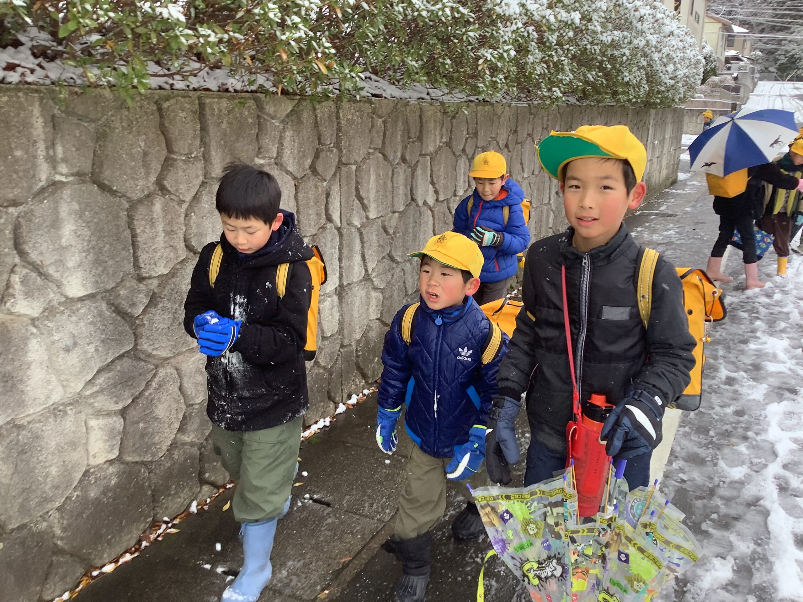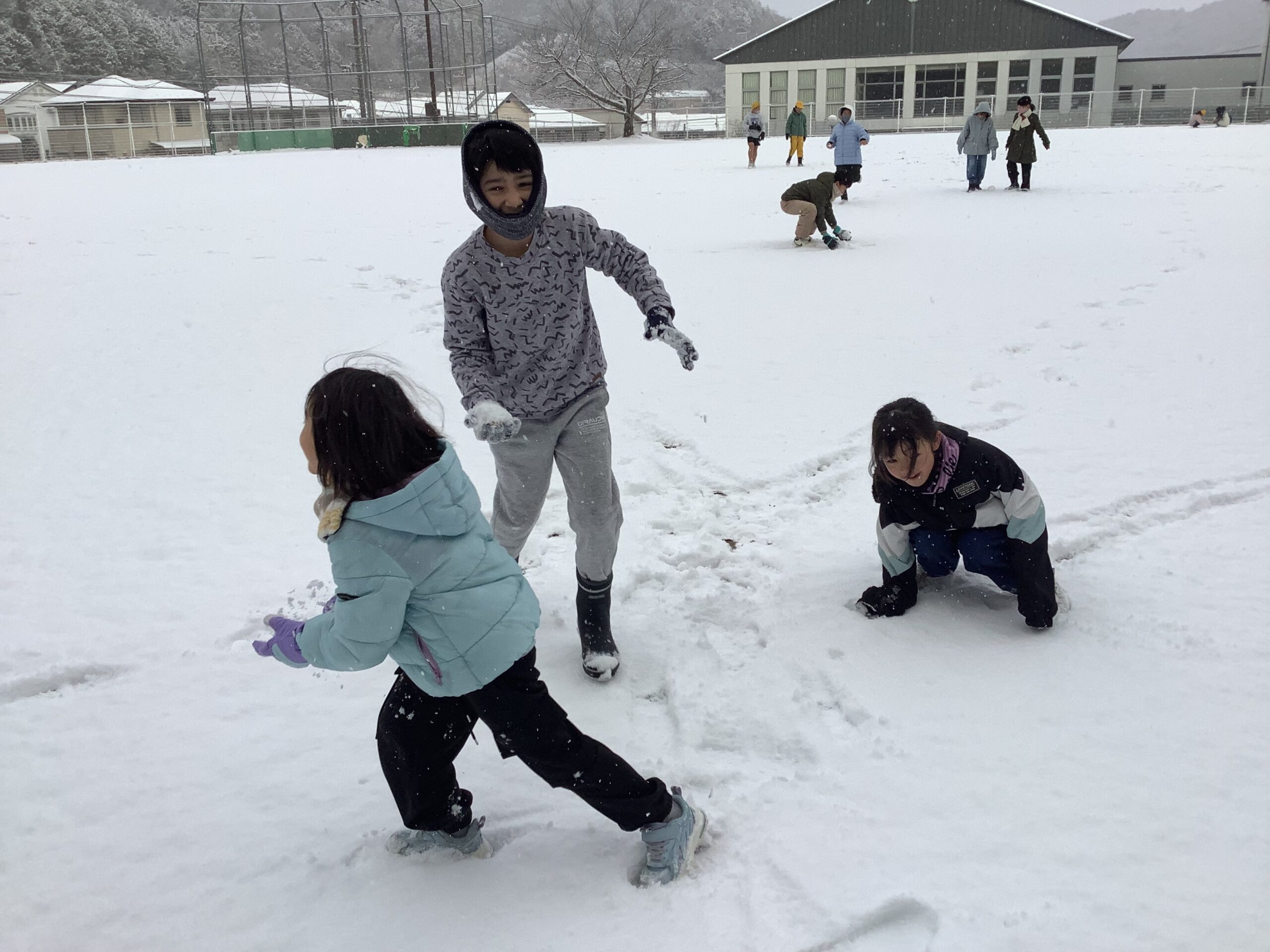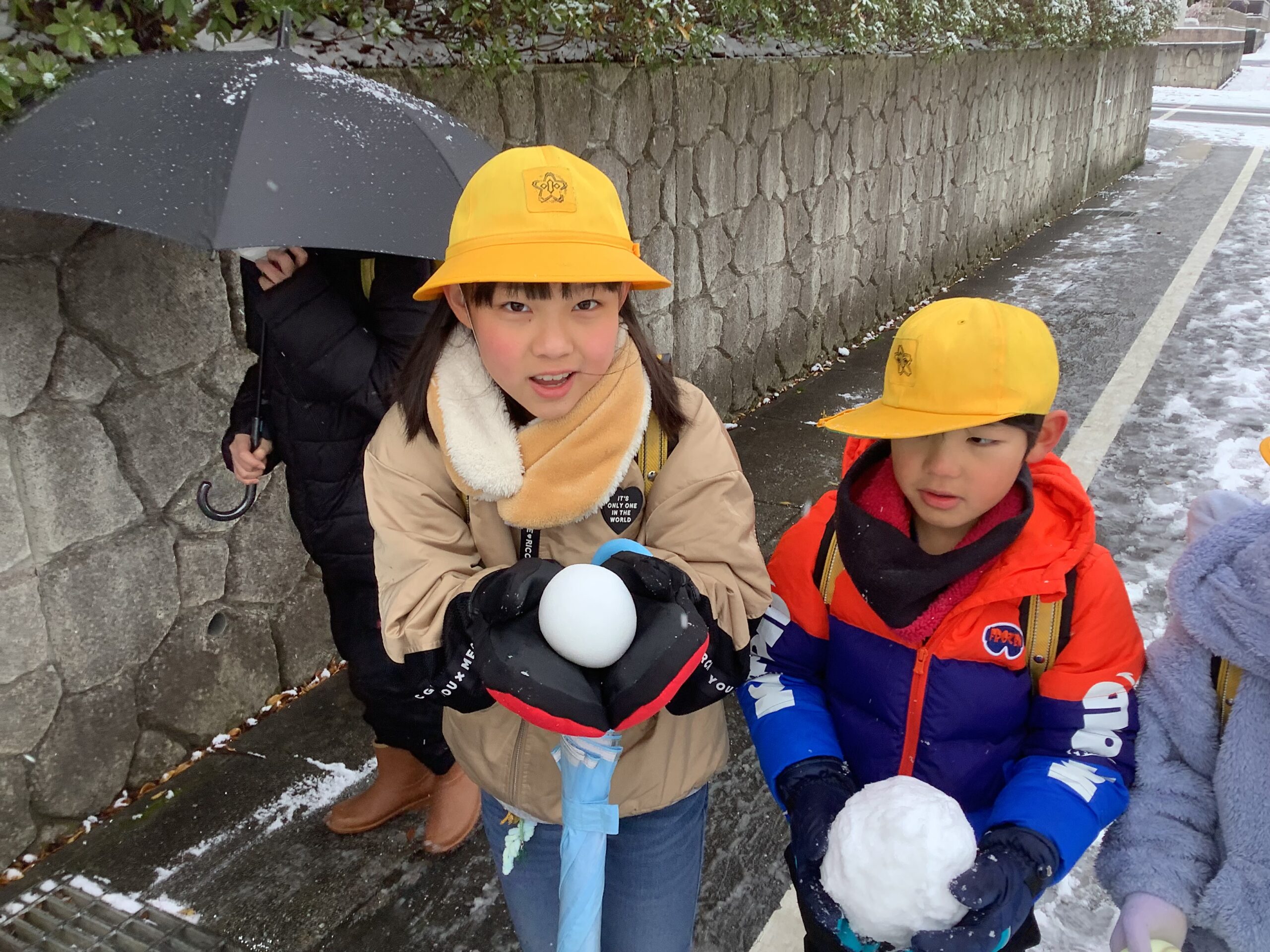 気温も冷え込みましたが、子どもたちは雪道に気を付けながら、元気に登校しました。「こんなに大きいのできたで!」と雪玉を見せてくれる子がたくさんいました。