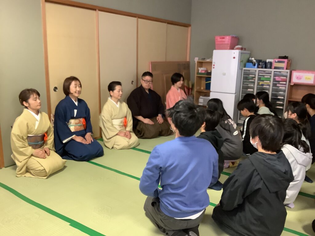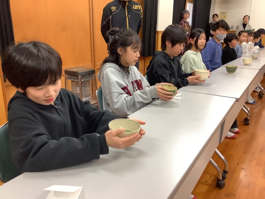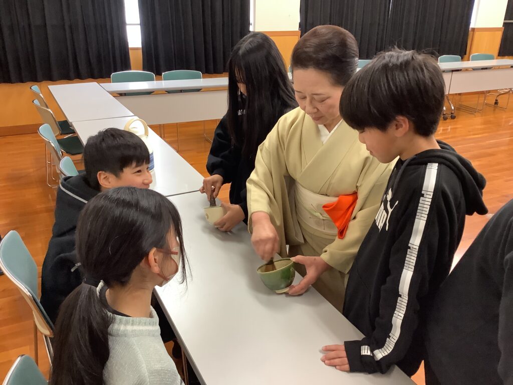 11月日(木)、京都府の事業「文化の心次世代継承事業 学校・茶の湯・出会いプロジェクト」を活用し、本校で6年生が「茶の湯体験」を行いました。このプロジェクトは茶道の各流派家元がそろう京都で、茶の湯を小中学生が体験することで、「茶の湯」や日本の文化について学びを深める取組です。様々な流派の中から、武者小路千家の講師の方に来ていただきました。