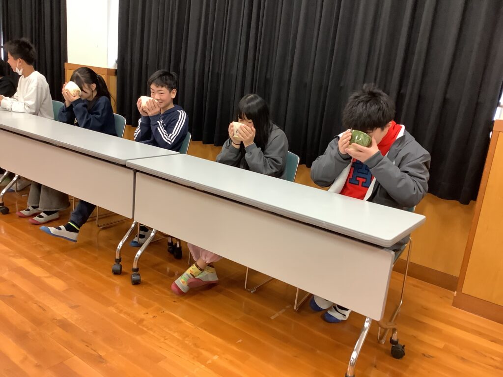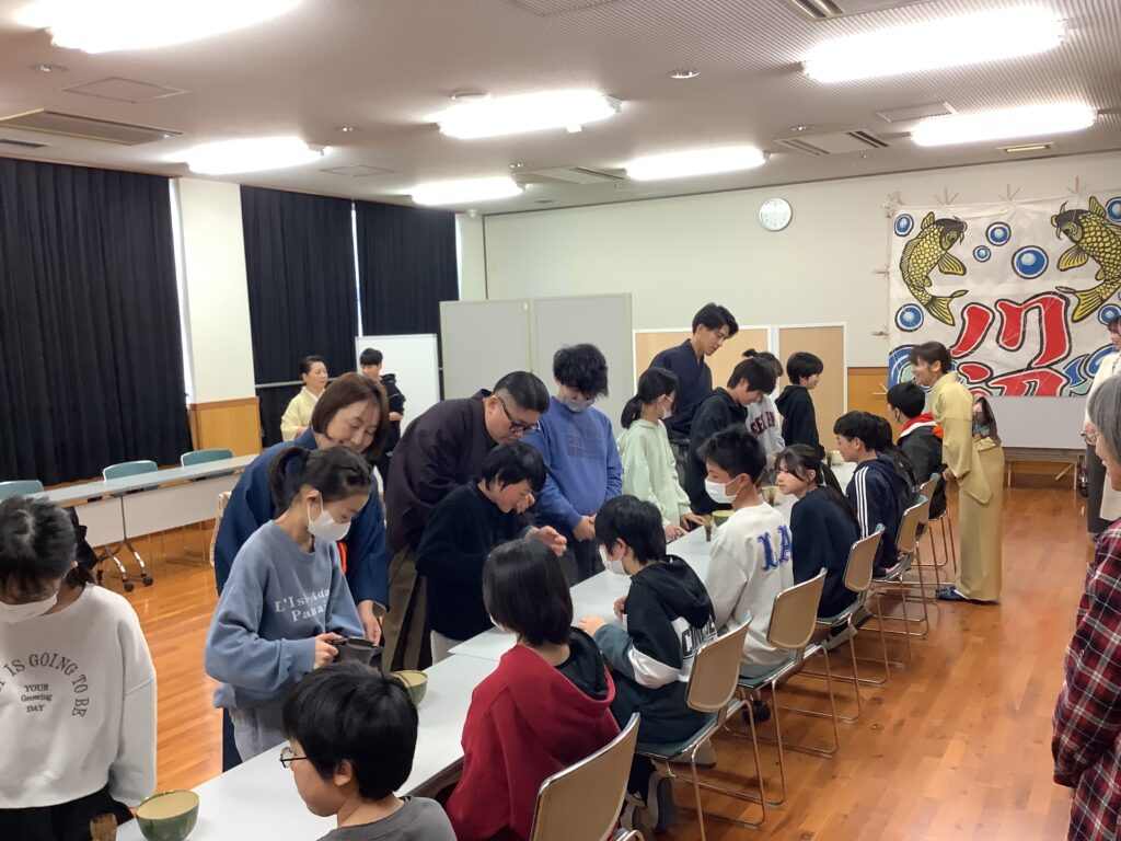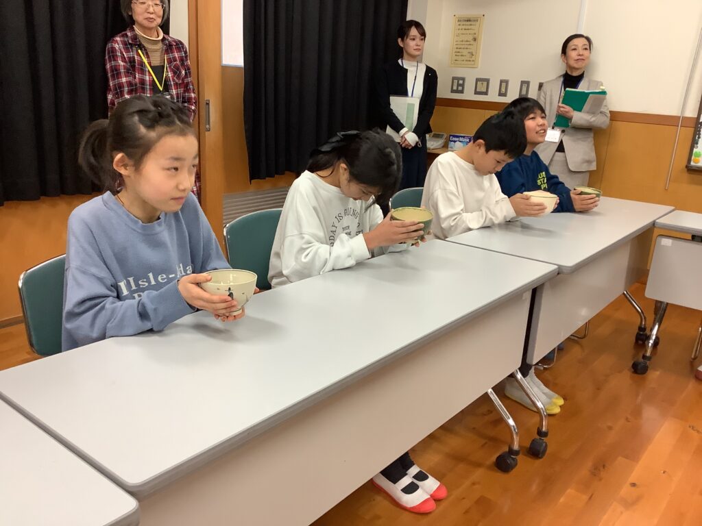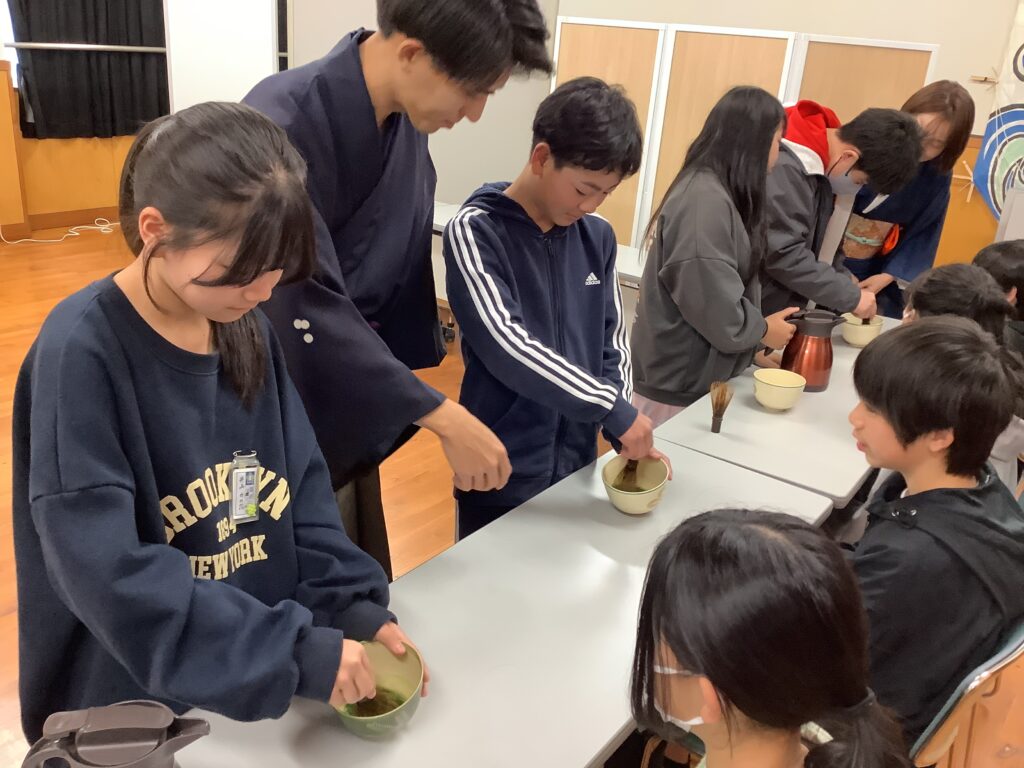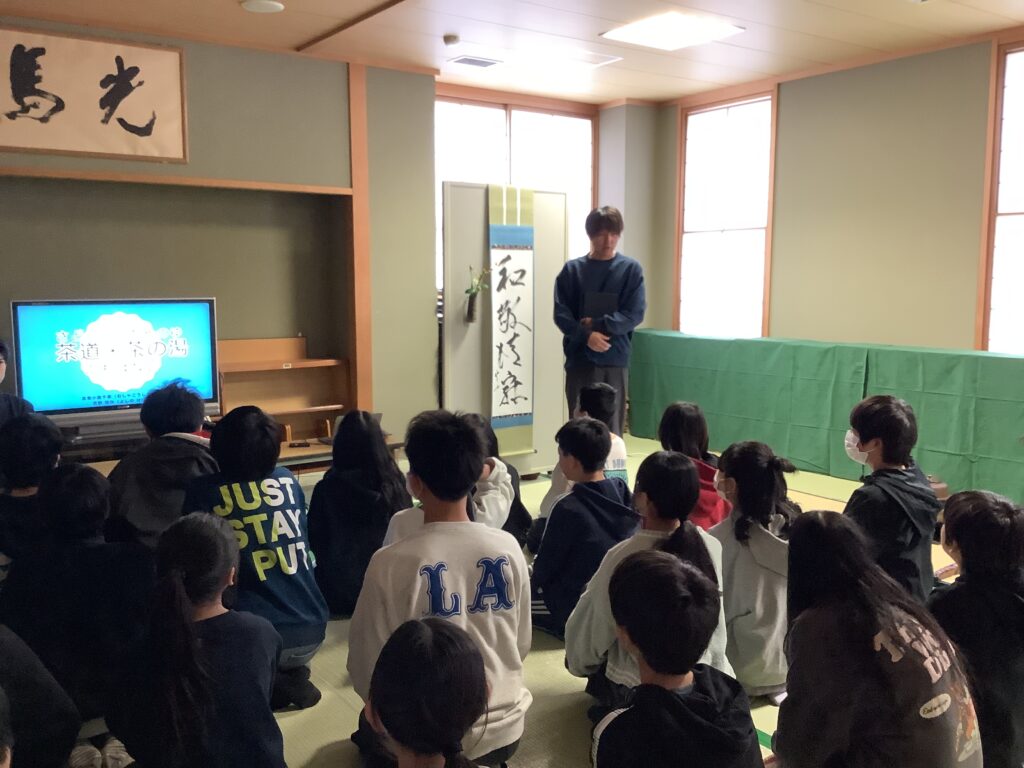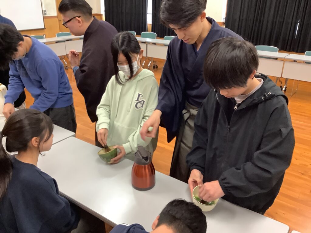 まず、茶道の面白さは、美味しいお茶をいただけることや茶道を通して、様々なことを学べること、また「あいさつ」や「人や道具を大切にする気持ち」を大切にされていることなど、お茶の歴史や作法を教えていただきました。そして、一人一人がお茶をいただいたり、実際にお茶を立てさせていただいたりしました。