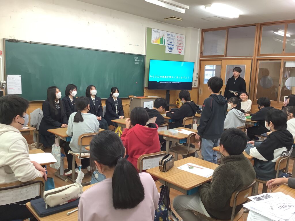 6年生は、メモをとったりうなずいたりしながら、大変興味をもってお話を聞くことができました。タブレットで資料を提示しながら、大変わかりやすく話をされる高校生の姿にも感心!「どうしたら、そんなに上手に話せるようになるのですか?」という質問も出ていました。少し先の未来の自分についてイメージを広げ、考える貴重な機会となりました。