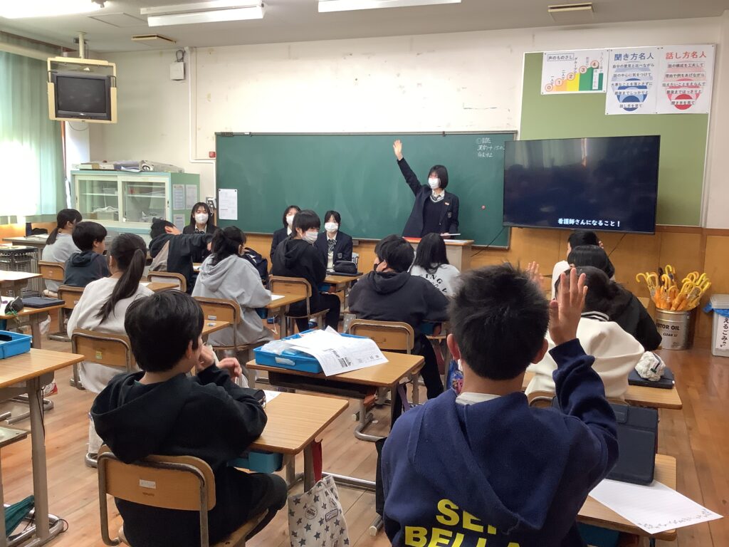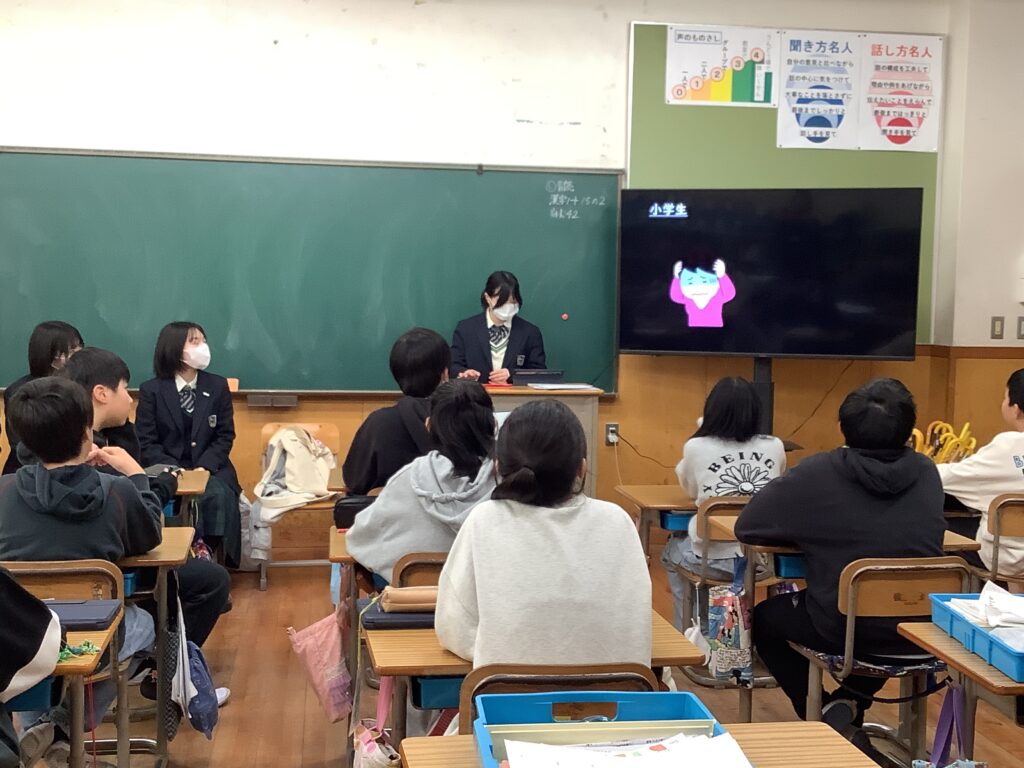 6年生は、総合的な学習でキャリア教育として、自分の将来や生き方を考える学習を行っています。今回は、本校の卒業生である園部高等学校の3年生4名に来校いただき、「小学校、中学校の思い出やその時代に大切だと感じたこと」「高校生活について」「進路について」「進路をきめた理由」など、様々なお話を聞かせていただきました。苦手な勉強も先生やおうちの方と一緒に諦めずに頑張ったことが力になったこと、クラブ活動の思い出、友達を大切にすること・・・。そして、大学受験には様々な方法があることや、進路を後押ししてくれる家族の大切さも話していただき、「まずできることは、普段から家族にありがとうを伝えること」など、高校生ならではの視点で小学生に素敵なメッセージをたくさん伝えてくださいました。